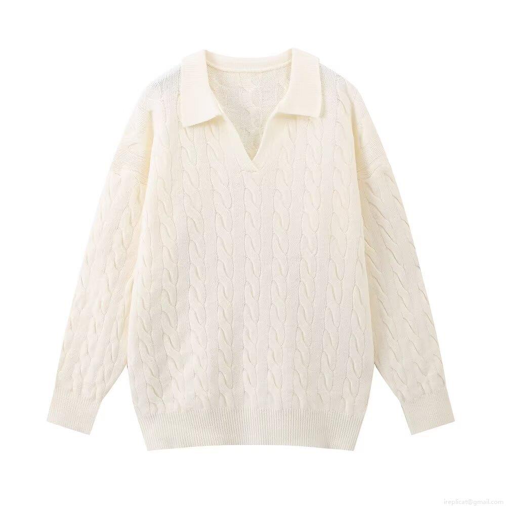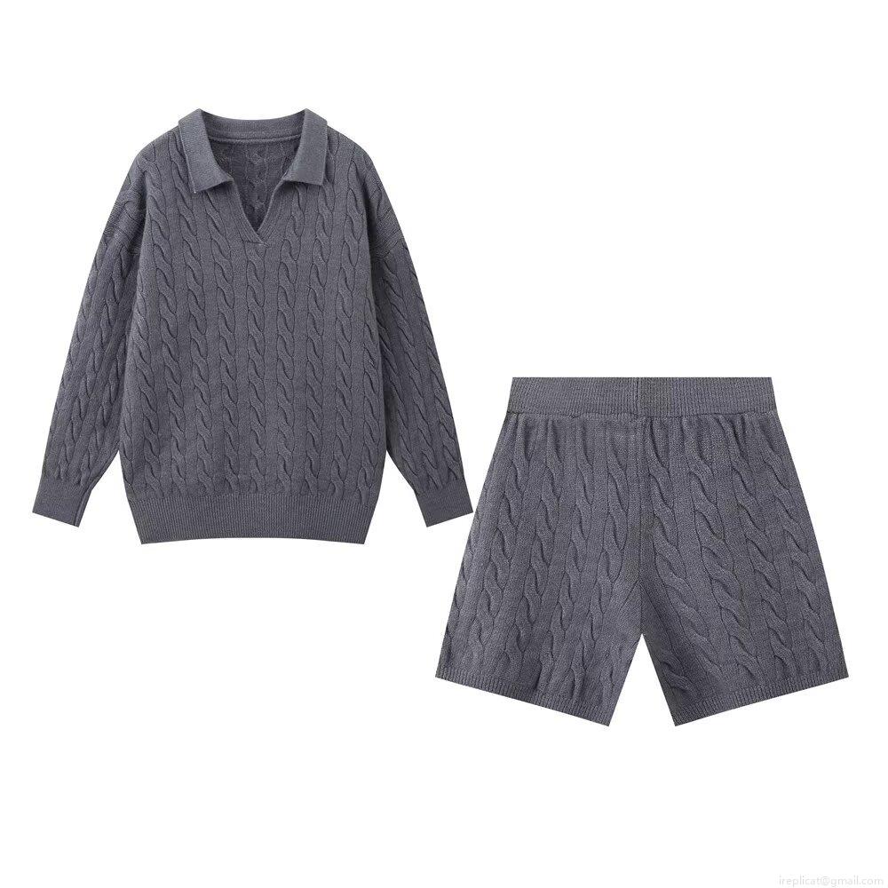 • Women Cable Knit Two Piece Outfits Long Sleeve Polo Collar Sweaters and Shorts Set 100% Polyester Ribbed Casual Loungewear Streetwear Set