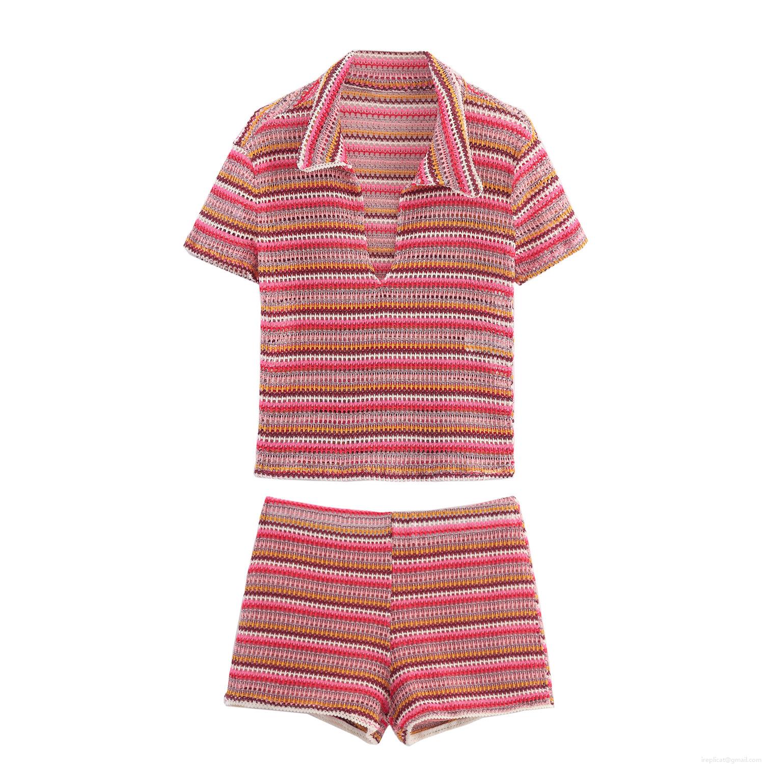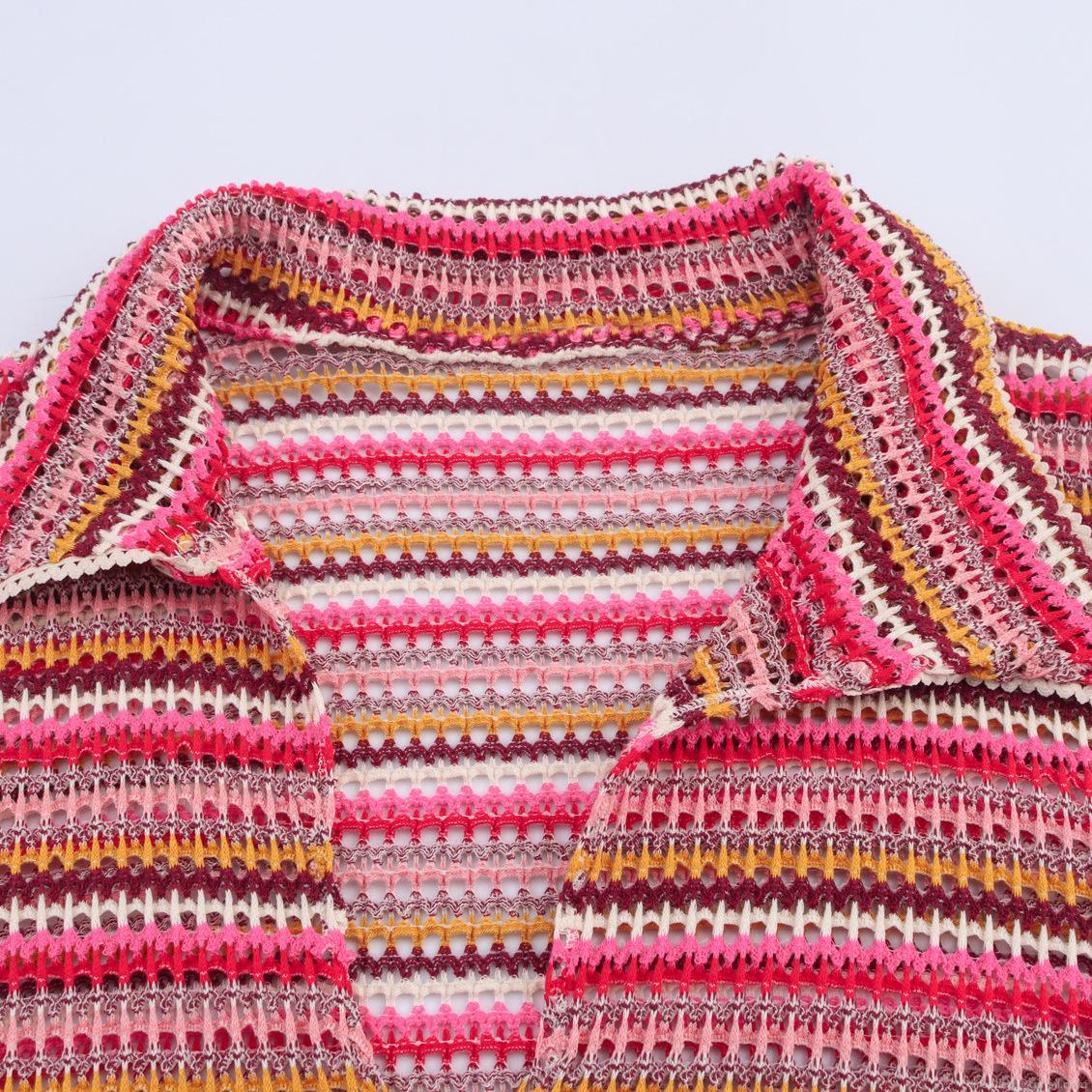 • Women Colorful Striped Crochet Knit Polo Shirt And Shorts Two-Piece Set Summer Casual Boho Hollow Out Short Sleeve Top Mini Shorts Clothing