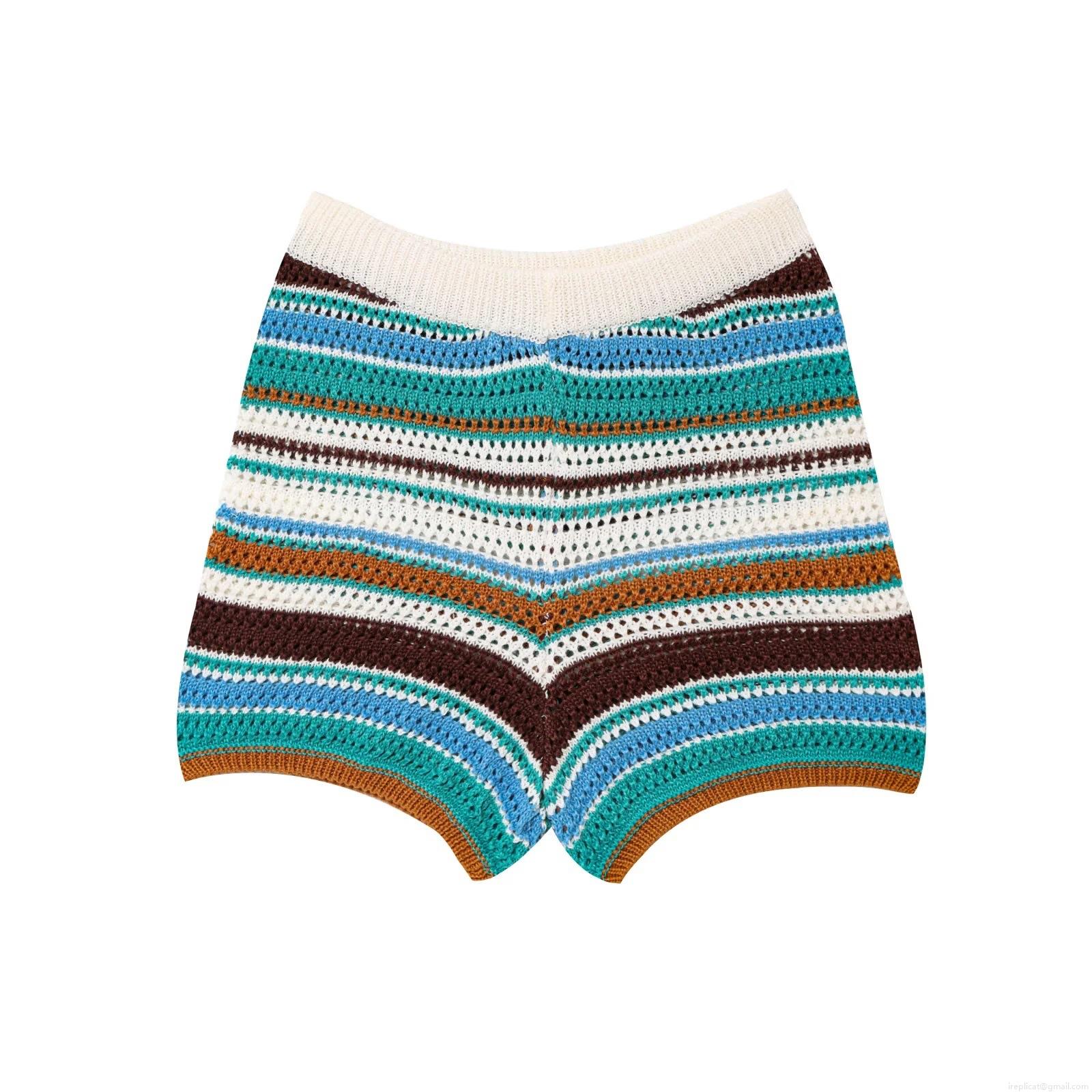 Women Crochet Stripe Polo Shirt And Shorts Set Bohemian Knit Short Sleeve Button Down Top High Waist Beach Shorts Two Piece Outfits