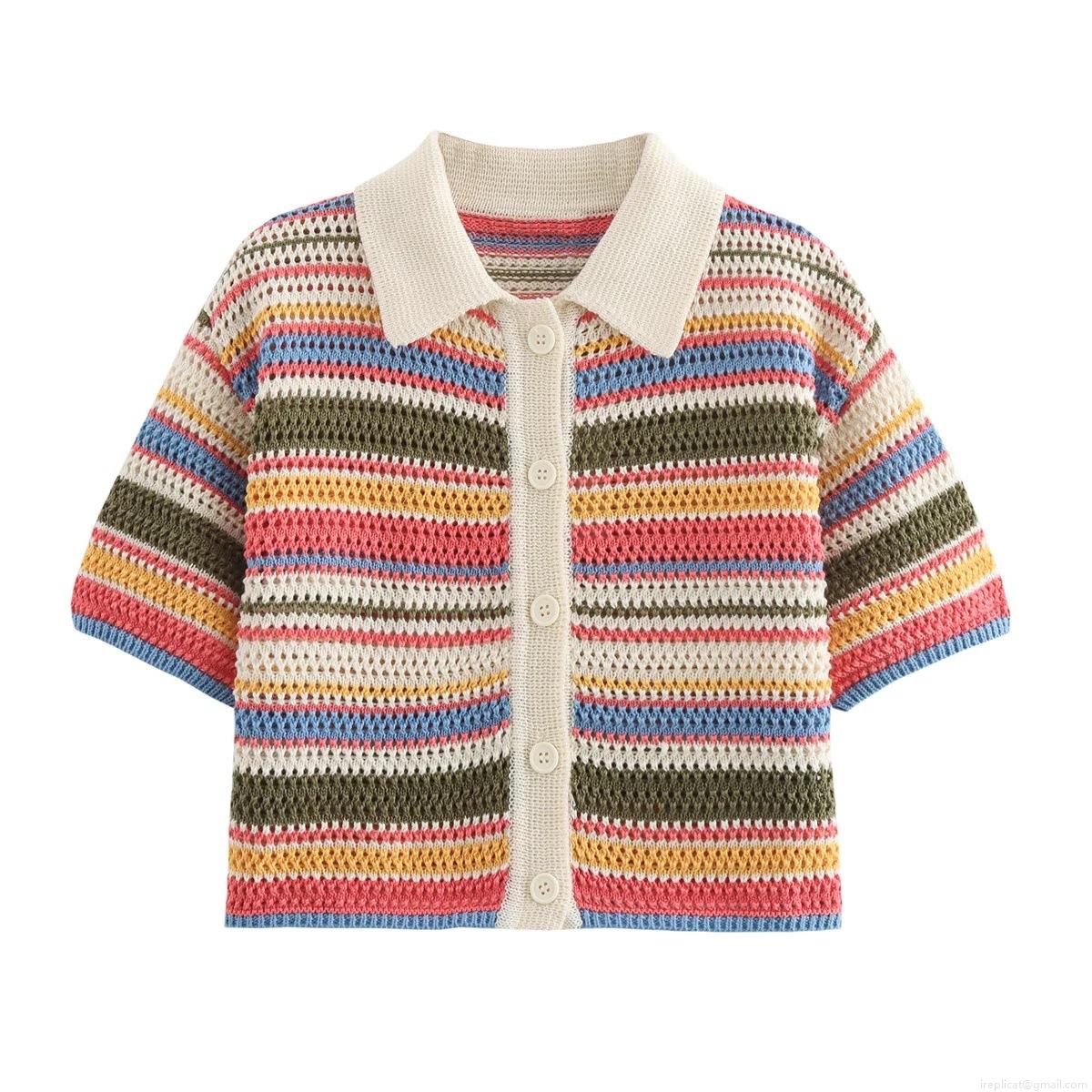 • Women Crochet Stripe Polo Shirt And Shorts Set Bohemian Knit Short Sleeve Button Down Top High Waist Beach Shorts Two Piece Outfits