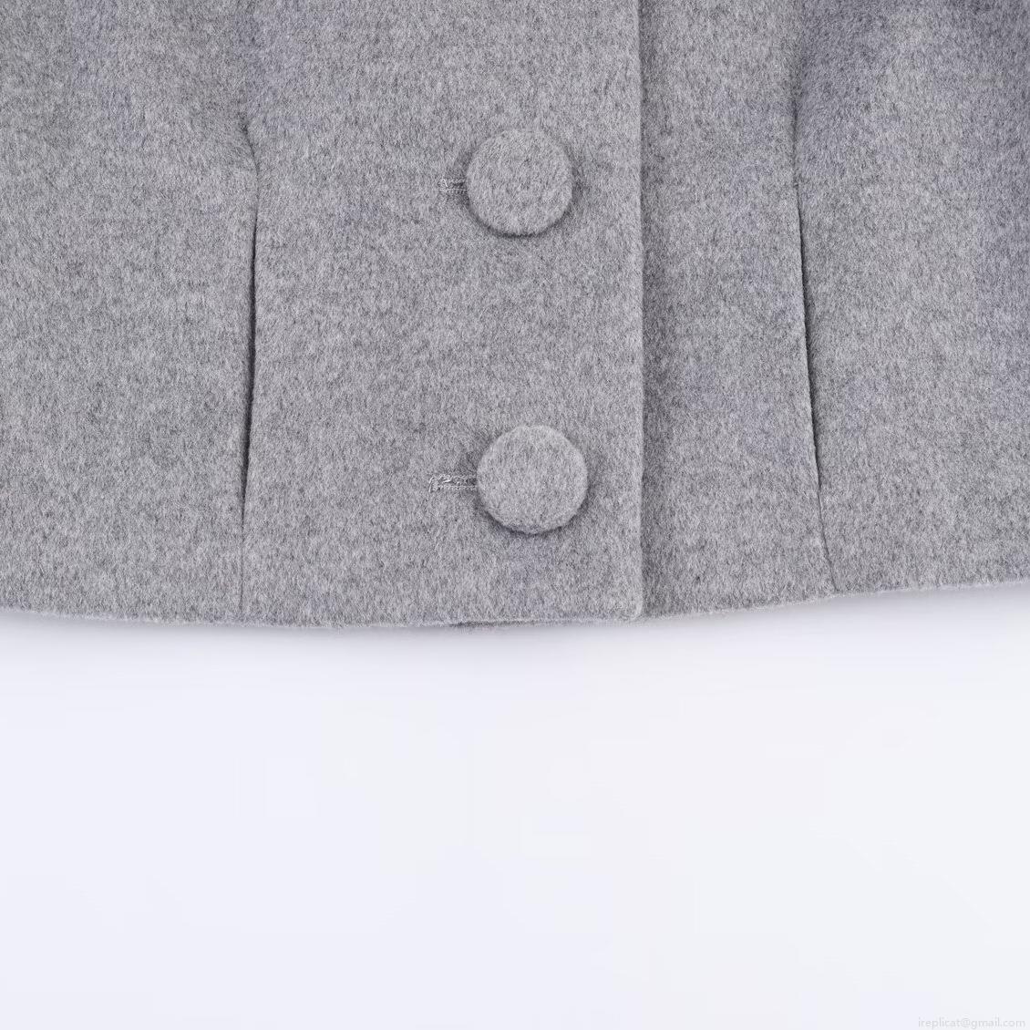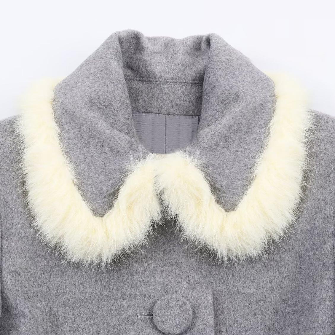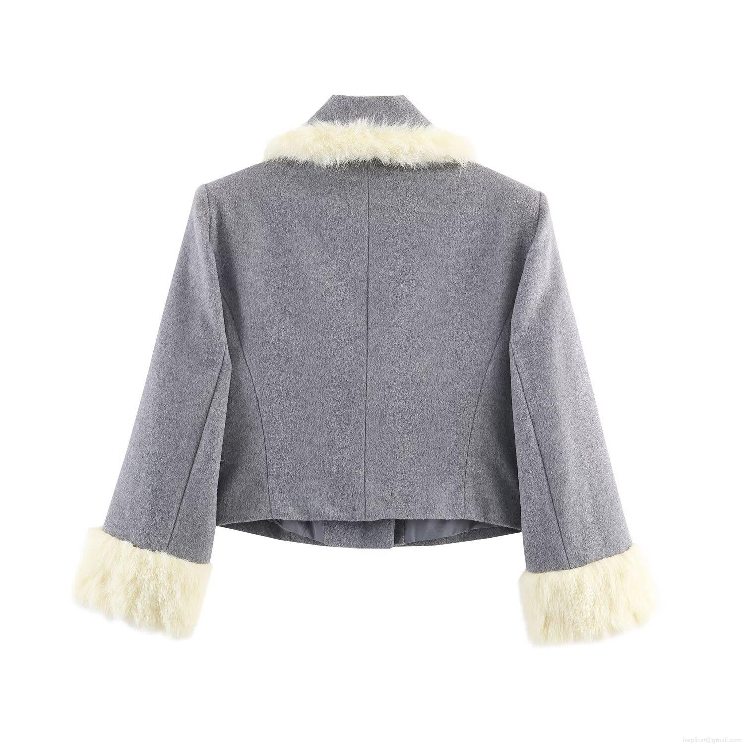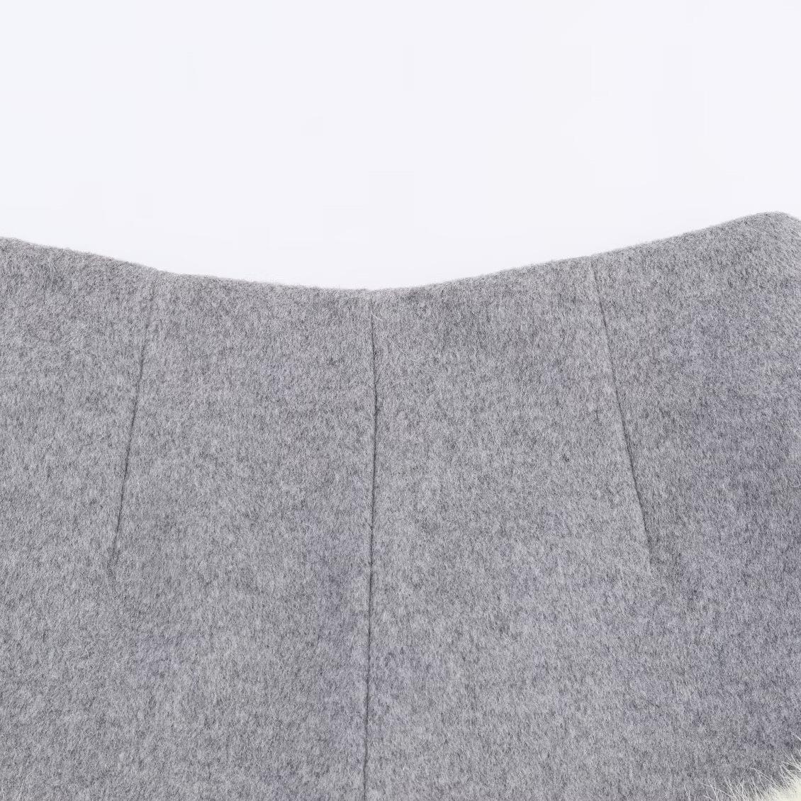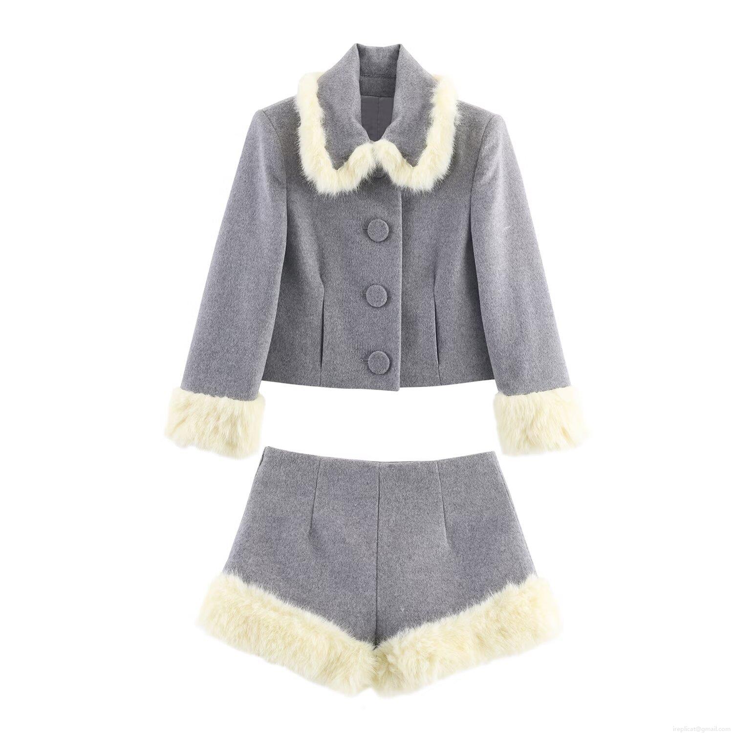 • Women Elegant Grey Woolen Tweed Two Piece Set Faux Fur Trim Long Sleeve Short Jacket And High Waist Shorts Socialite Autumn Winter Outfits