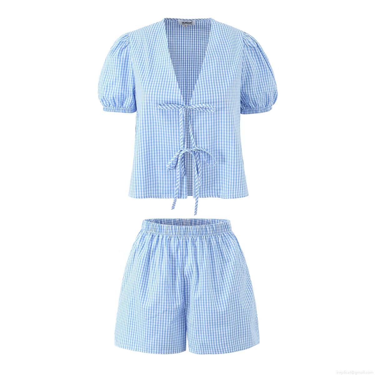 • Women French Vacation Gingham Two Piece Set Puff Short Sleeve V Neck Tie Front Top High Waist Shorts Set Summer Casual Cotton Blend Outfit