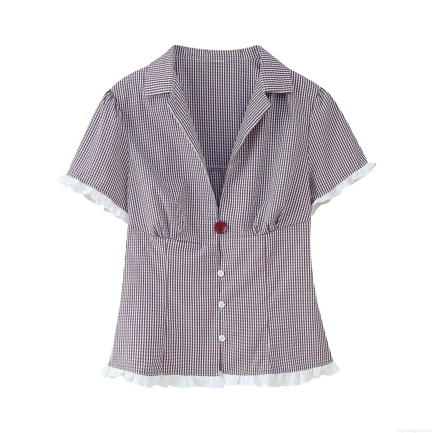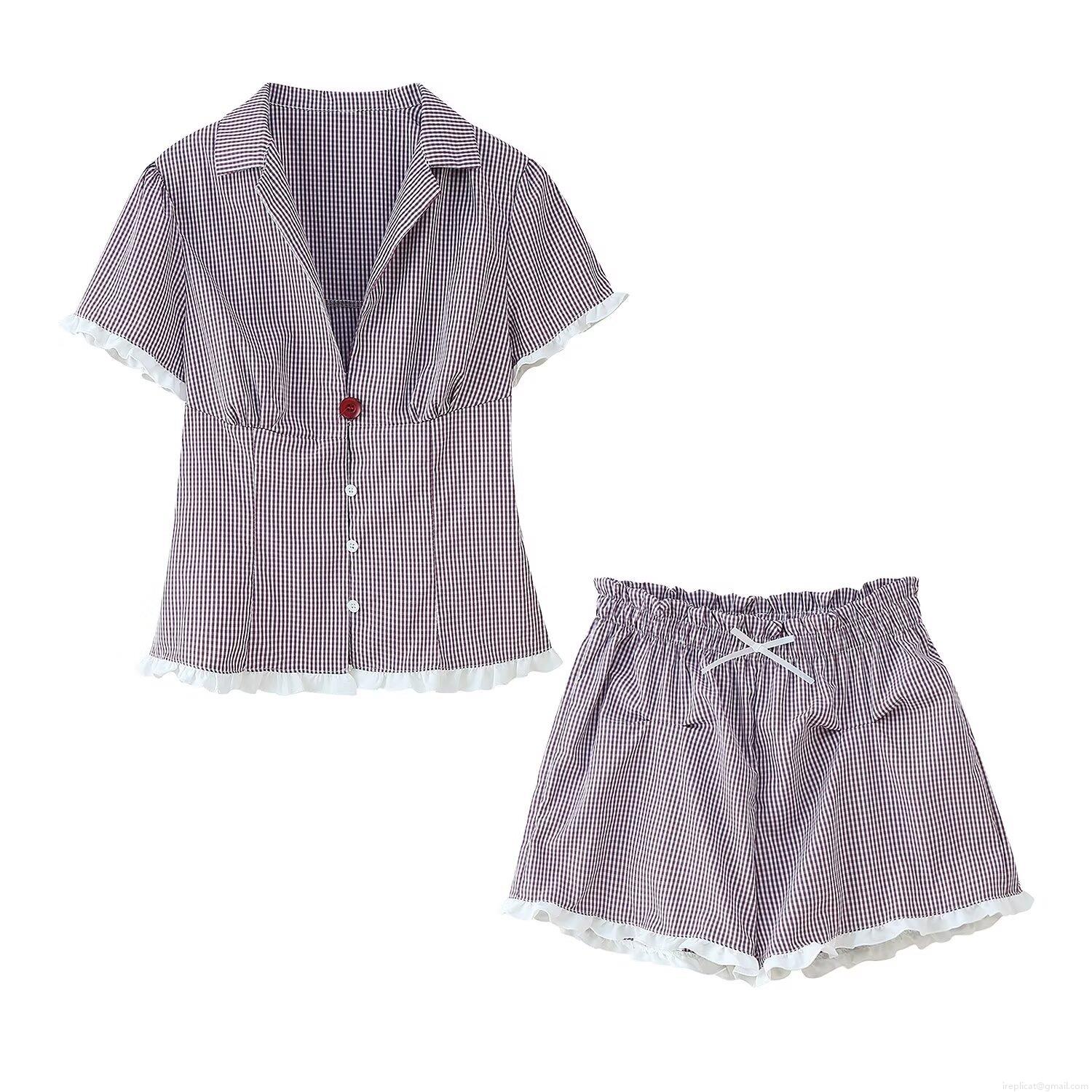 • Women Retro Gingham Plaid Two Piece Set Ruffle Hem Short Sleeve Button Down Shirt And Elastic Waist Shorts Summer Casual Matching Outfit