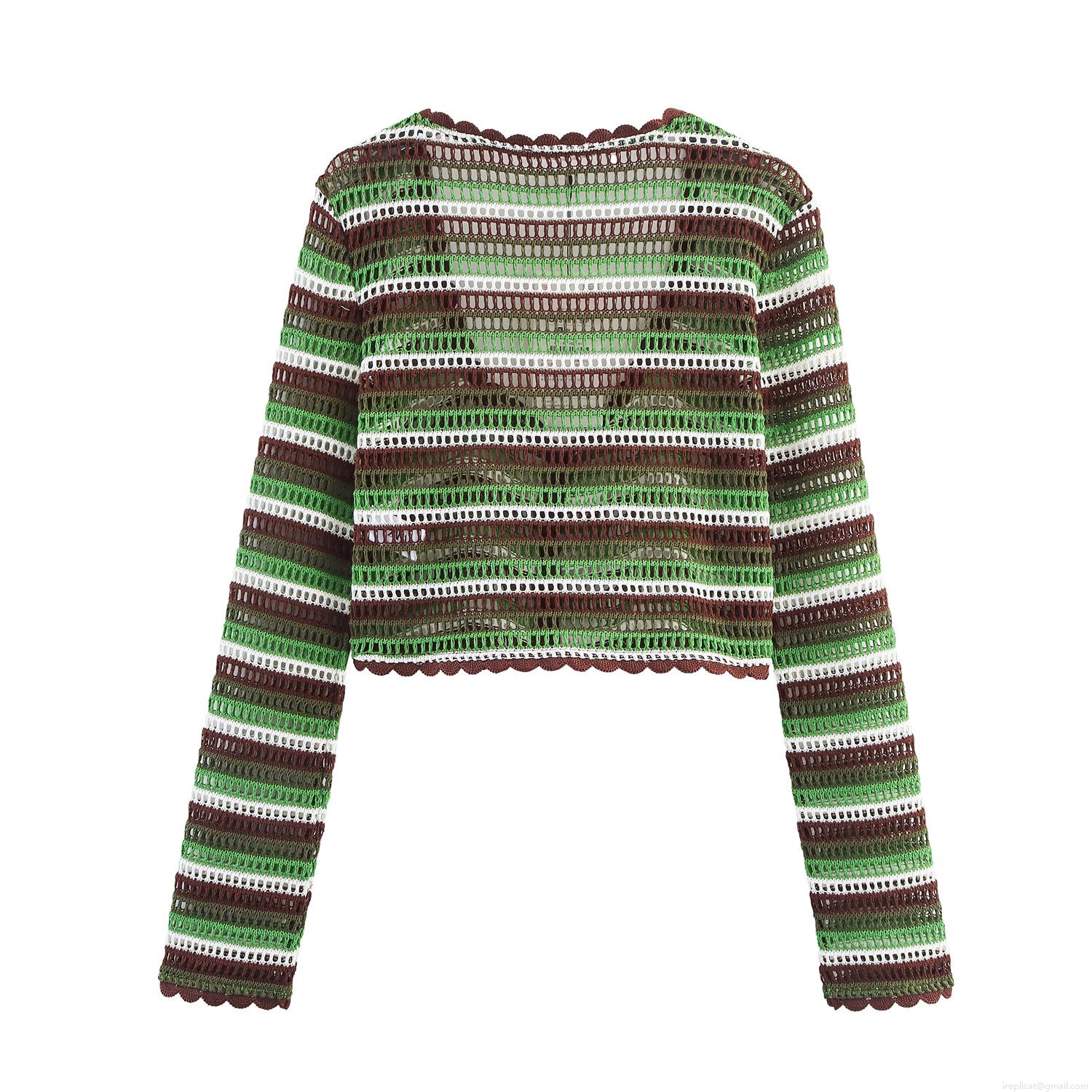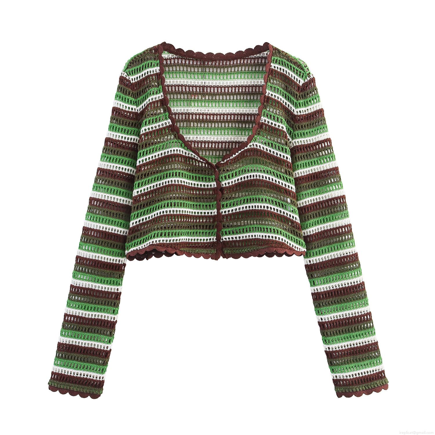 • Women Striped Crochet Knit 2 Piece Outfits Long Sleeve Crop Top Cardigan and Drawstring Scalloped Shorts Set Bohemian Beach Vacation Wear