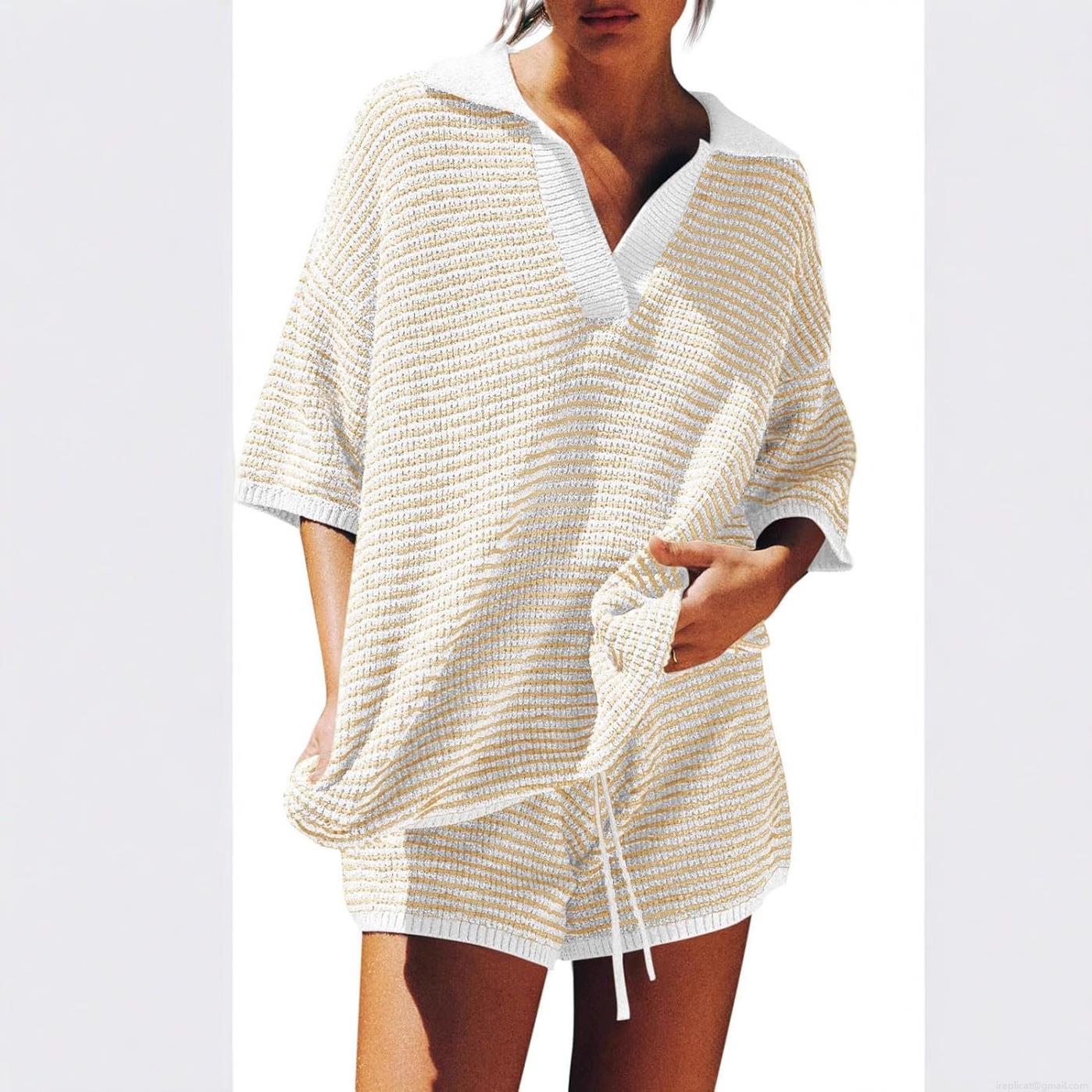 Women Striped Knitwear Two Piece Set Casual V-Neck Half Sleeve Top and High Waist Shorts Loungewear Viscose Knitted Comfortable Tracksuit Home Wear
