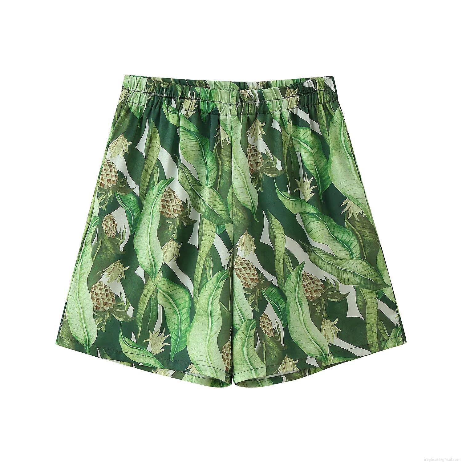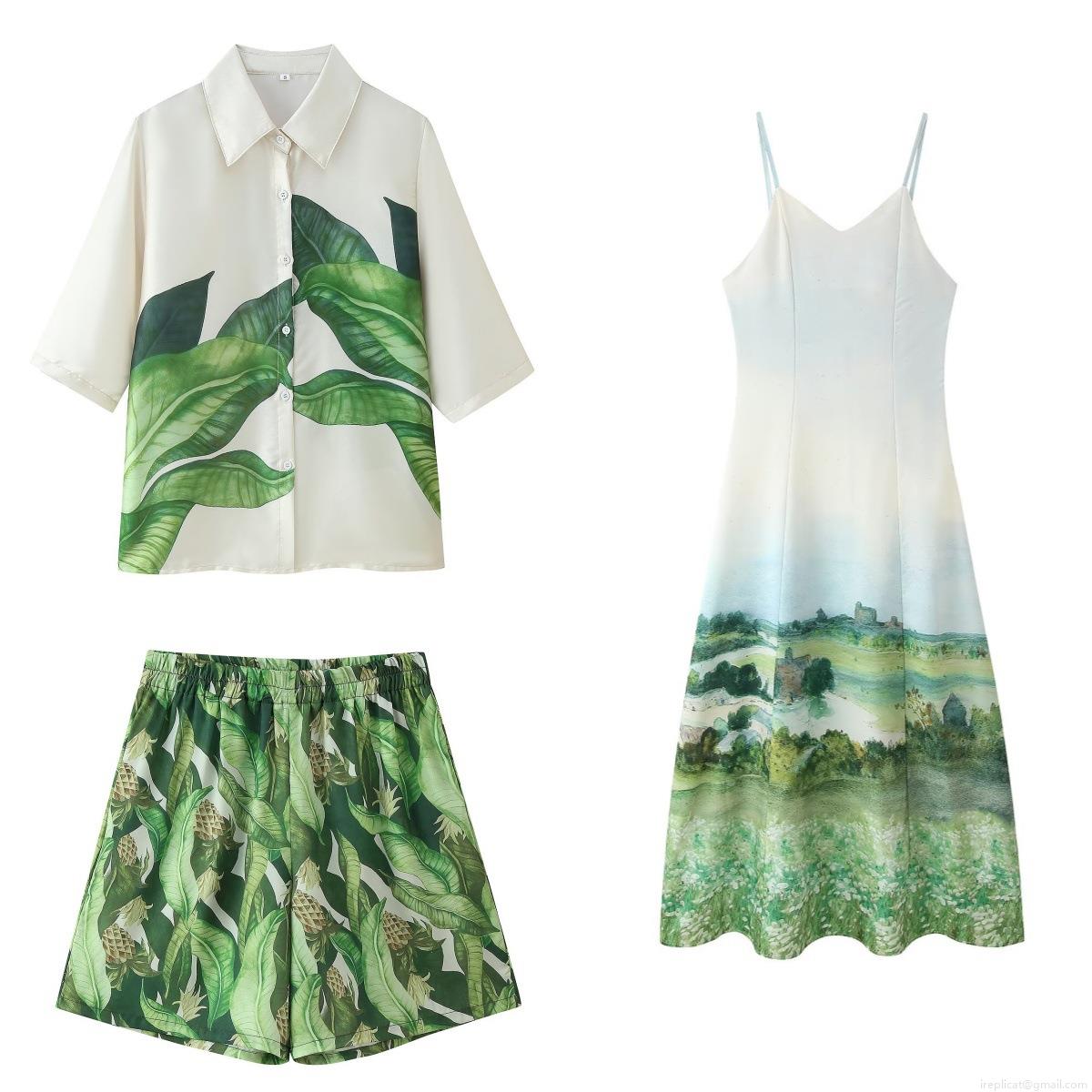 • Women Tropical Leaf Print Short Sleeve Shirt High Waist Shorts And Scenery Oil Painting Strap Dress 3-Piece Set Summer Vacation Streetwear Polyester Outfits
