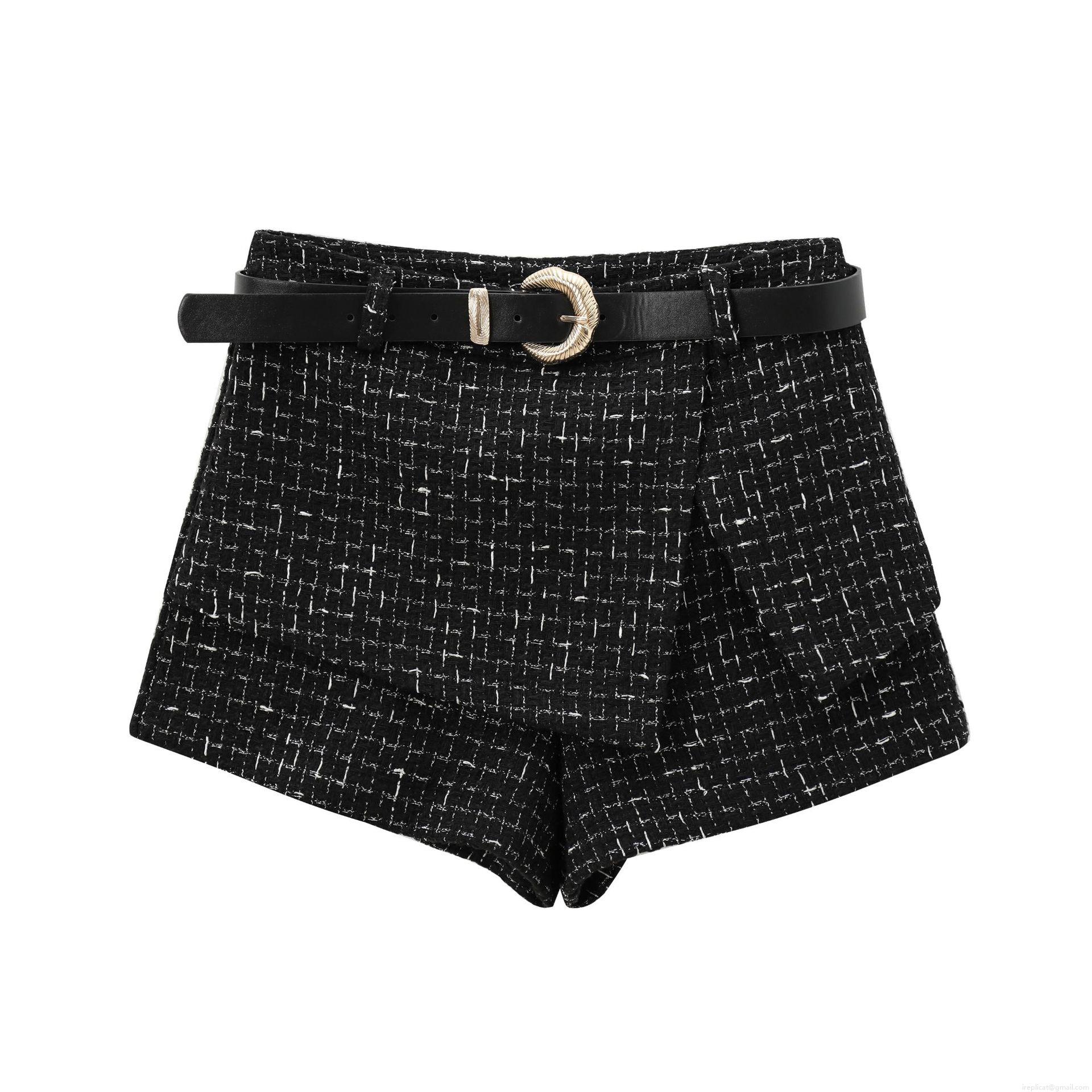 Splice, Texture, Checkered Pattern, Short, Buttons, Tweed, High-waisted, Metal Buckle Thin Belt
