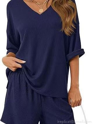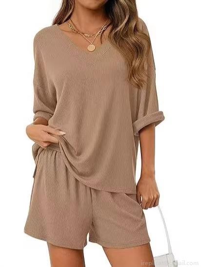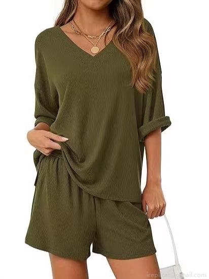 • Women's 2 Piece Casual Lounge Set V Neck Short Sleeve Waffle Knit T-Shirt And Drawstring Shorts Summer Outfits Loose Solid Color Homewear