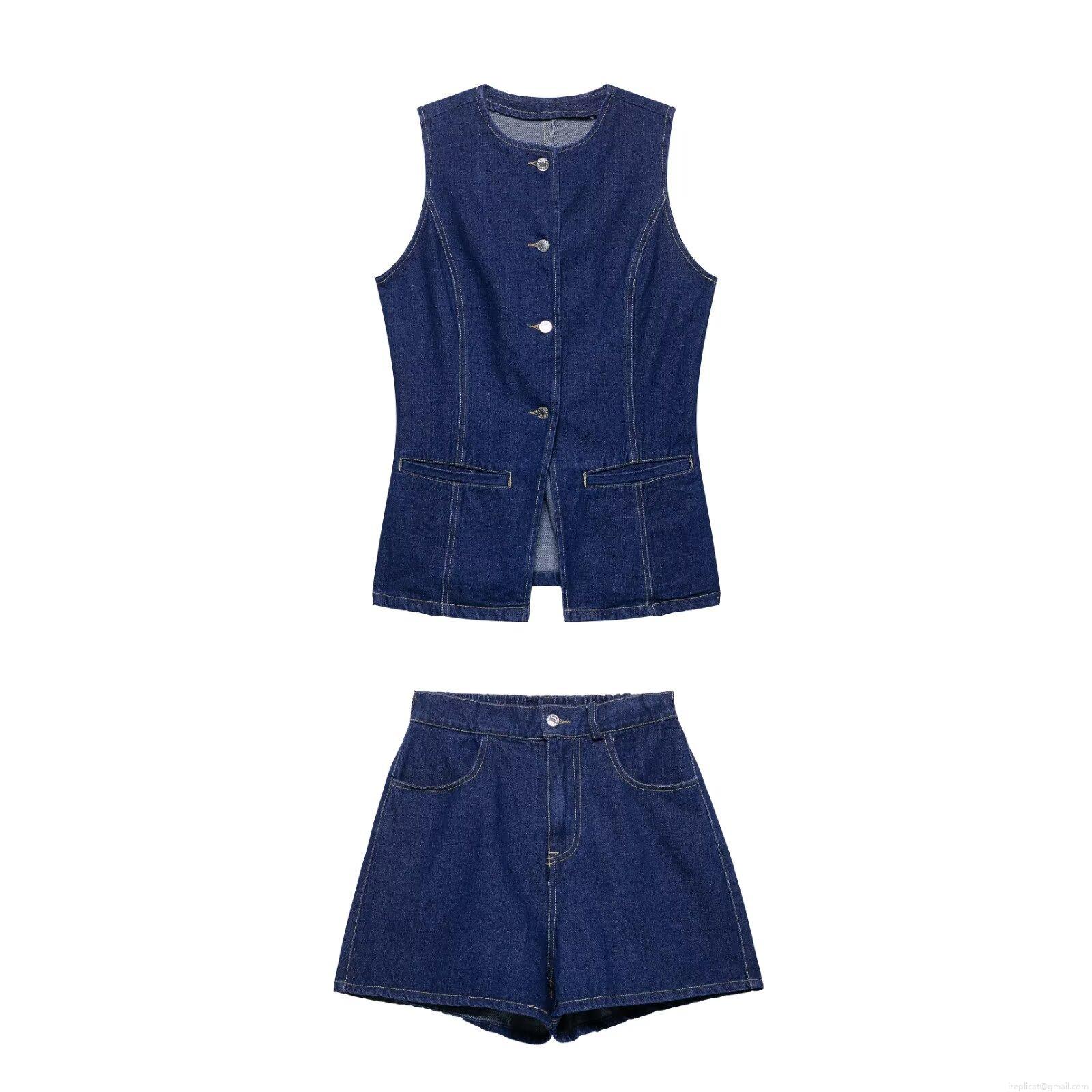• Women's 2 Piece Denim Shorts Set Summer Dark Blue Sleeveless Waistcoat Vest And Elastic Waist Shorts Streetwear Contrast Stitching Jean Outfits For Women