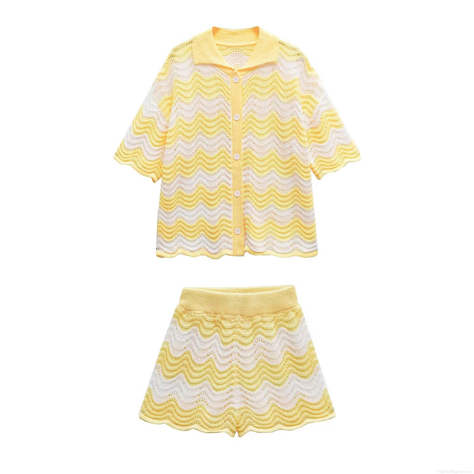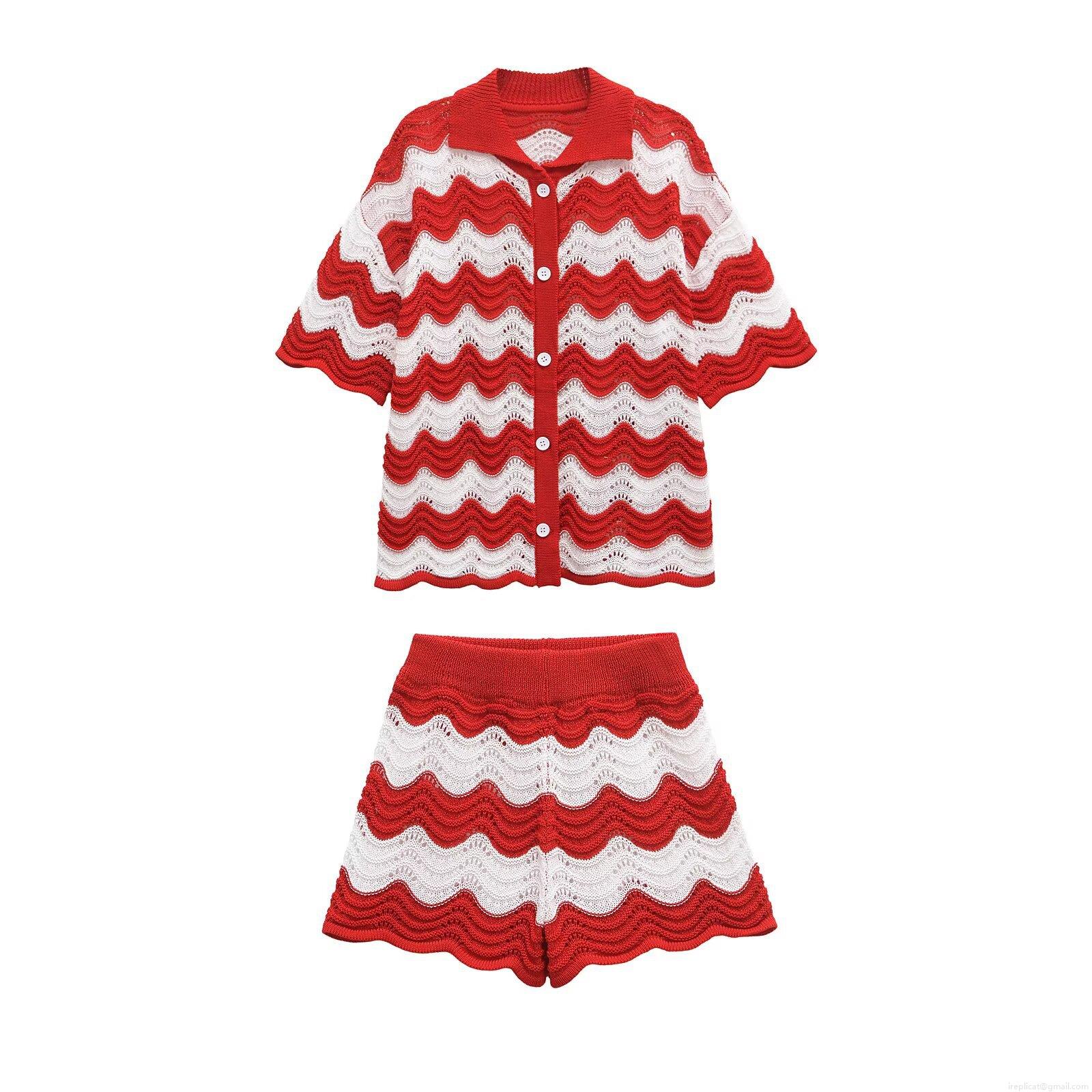 • Women's 2 Piece Knit Outfits Crochet Wave Pattern Striped Short Sleeve Button Down Cardigan Polo Shirt and High Waist Shorts Set Summer Beach Casual Streetwear Boho Vacation Suit