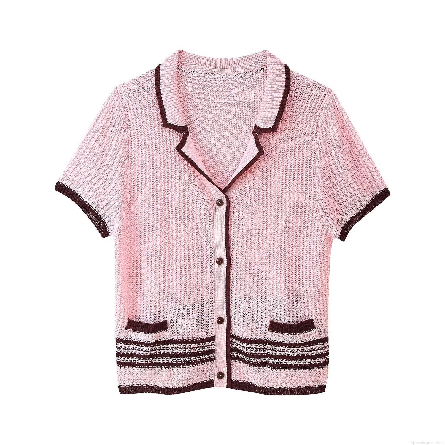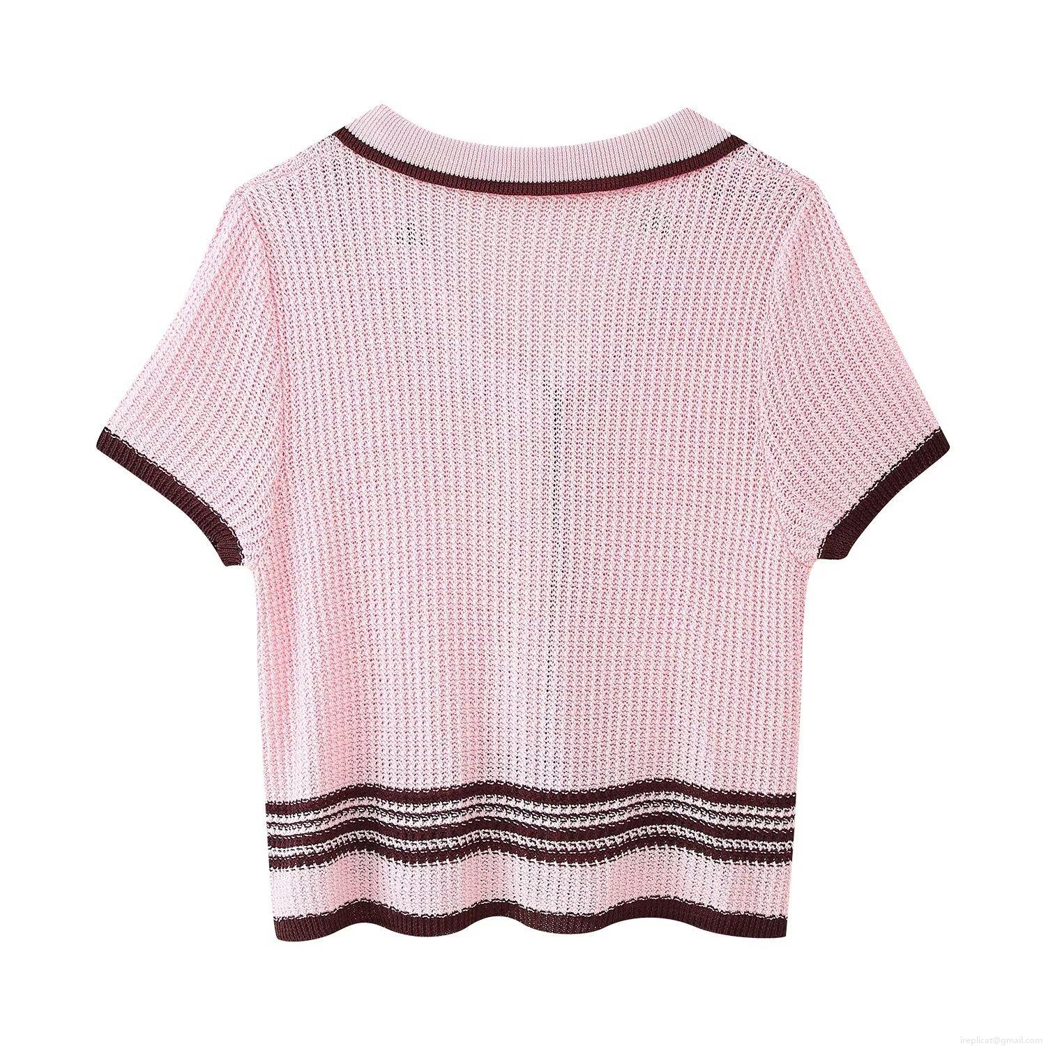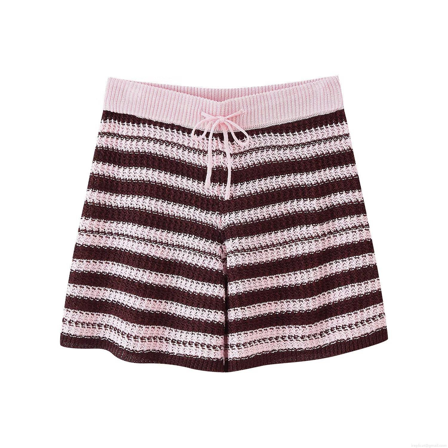 • Women's 2 Piece Knit Outfits Set Colorblock Striped Short Sleeve Button Up Polo Cardigan Top And Elastic Waist Drawstring Shorts Streetwear Clothing