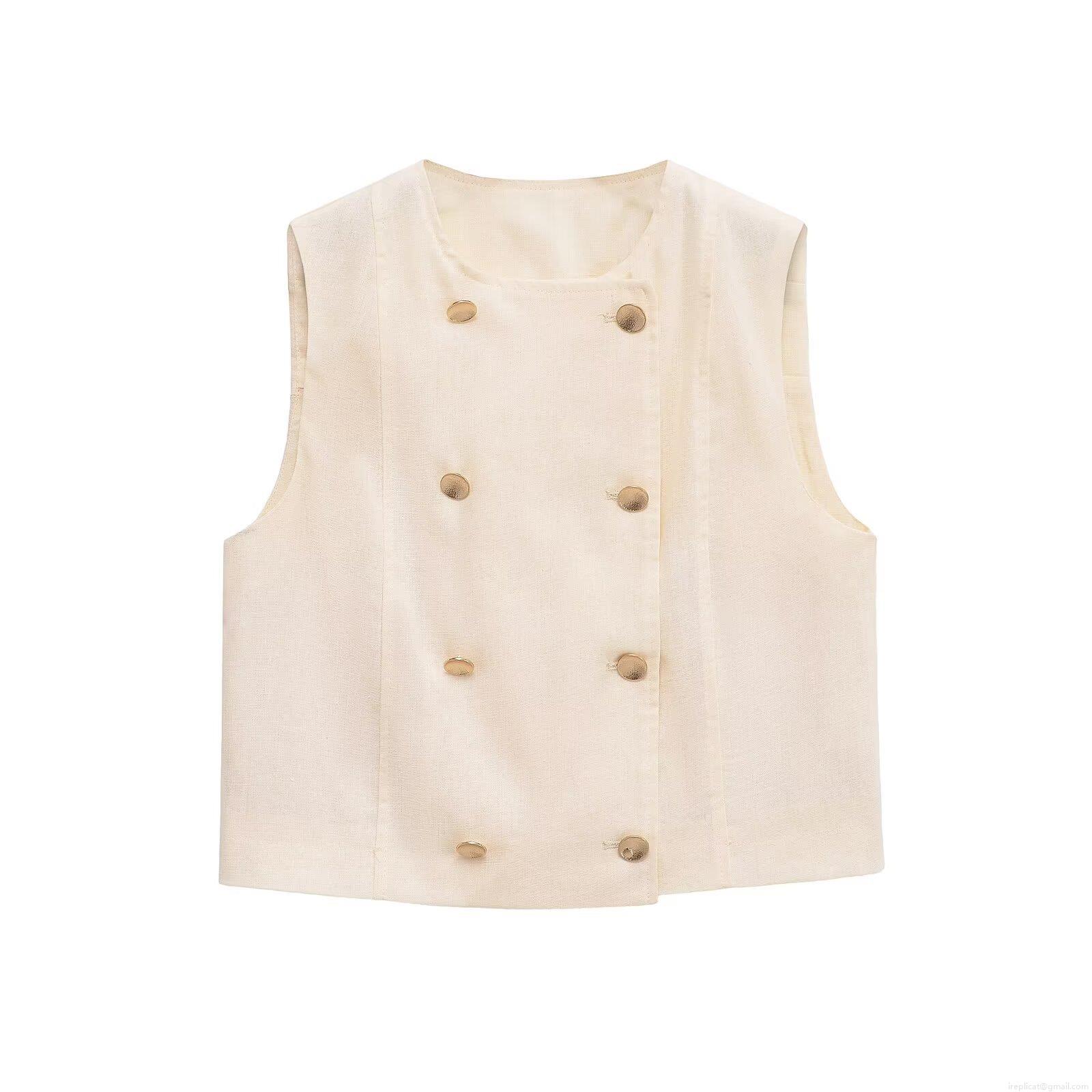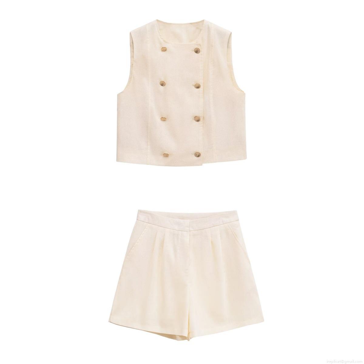 Women's 2 Piece Shorts Sets Casual Sleeveless Double Breasted Vest And High Waist Loose Shorts Summer Linen Like Polyester Outfit Cream White Streetwear