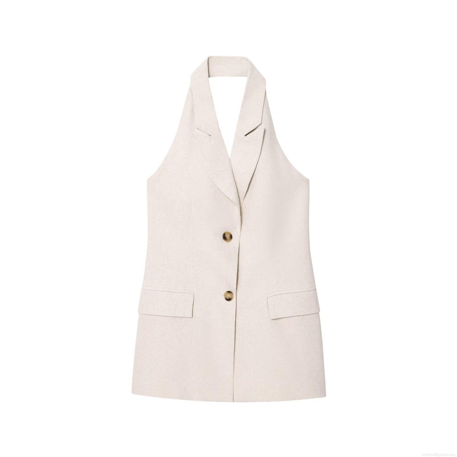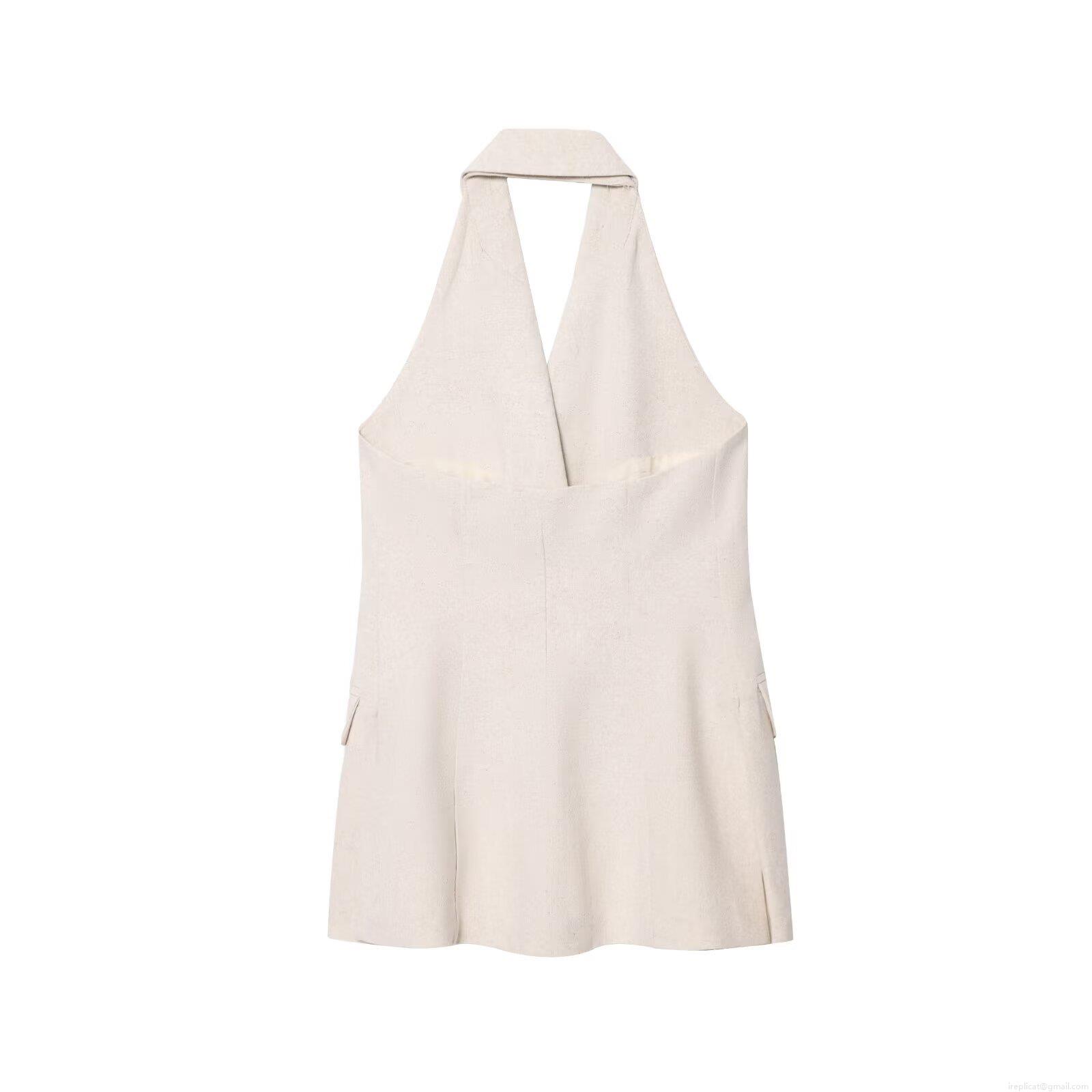 • Women's 2 Piece Summer Outfit Halter Neck Backless Waistcoat Vest And High Waist Shorts Linen Cotton Blend Casual Streetwear Suit Beige