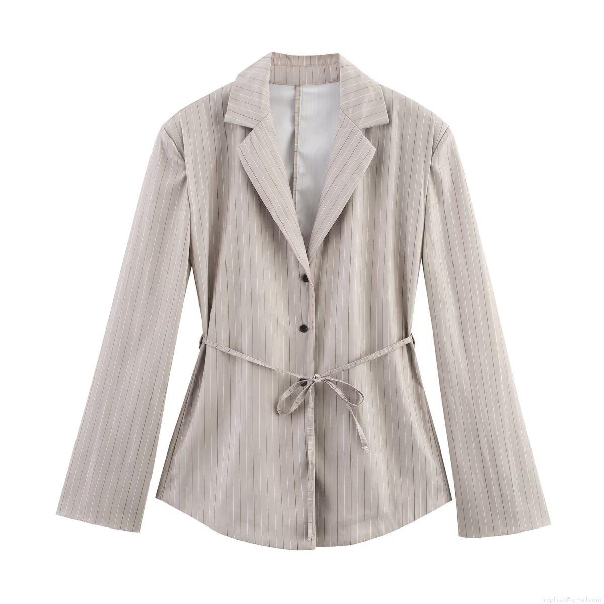 Women's 2-Piece Business Casual Suit Set With Long Sleeve Belted Blazer And Matching Striped Shorts Summer Office Lady Streetwear Outfit
