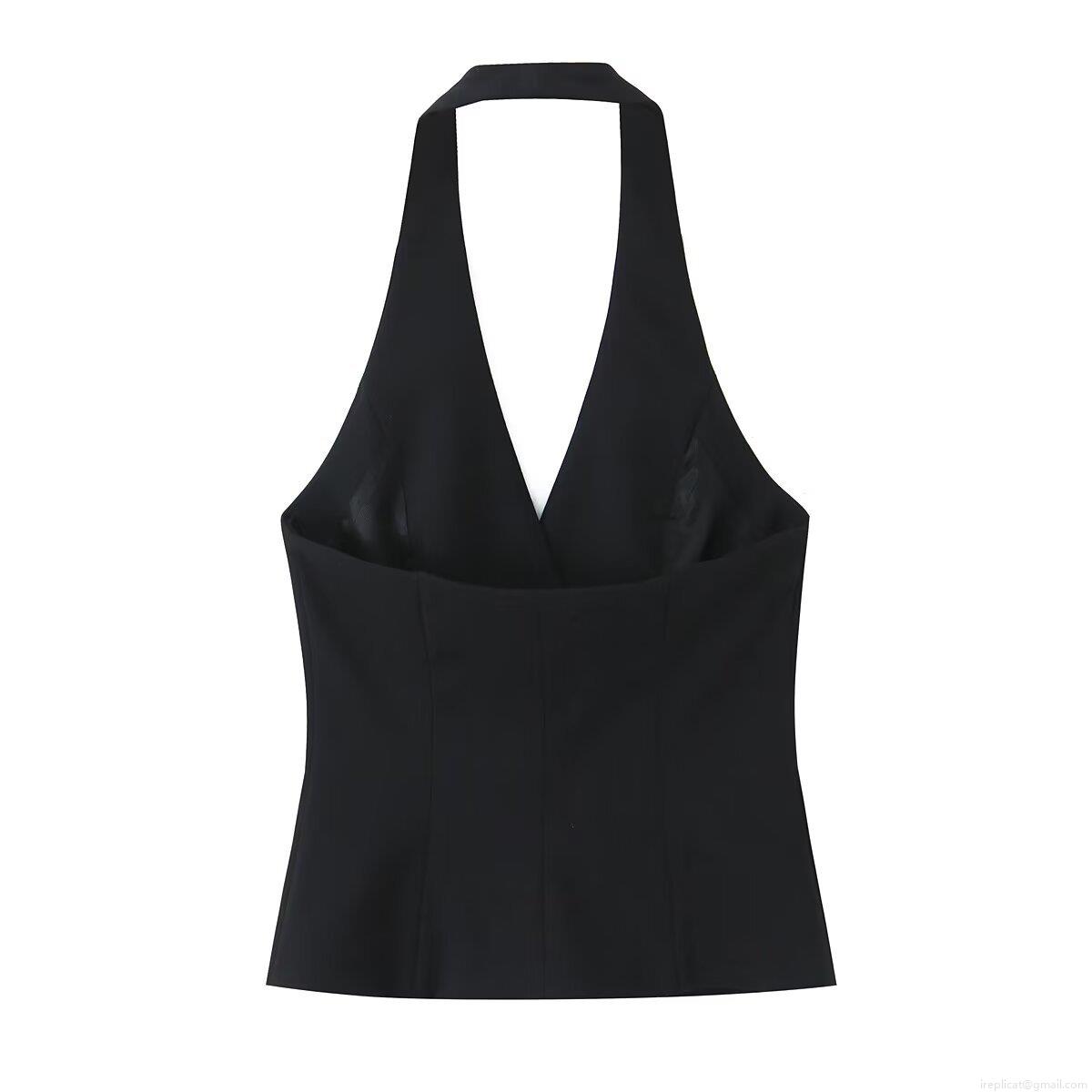 Solid Color, Splice, Backless, Double-breasted, Neckband Design, Fabric-covered Buttons