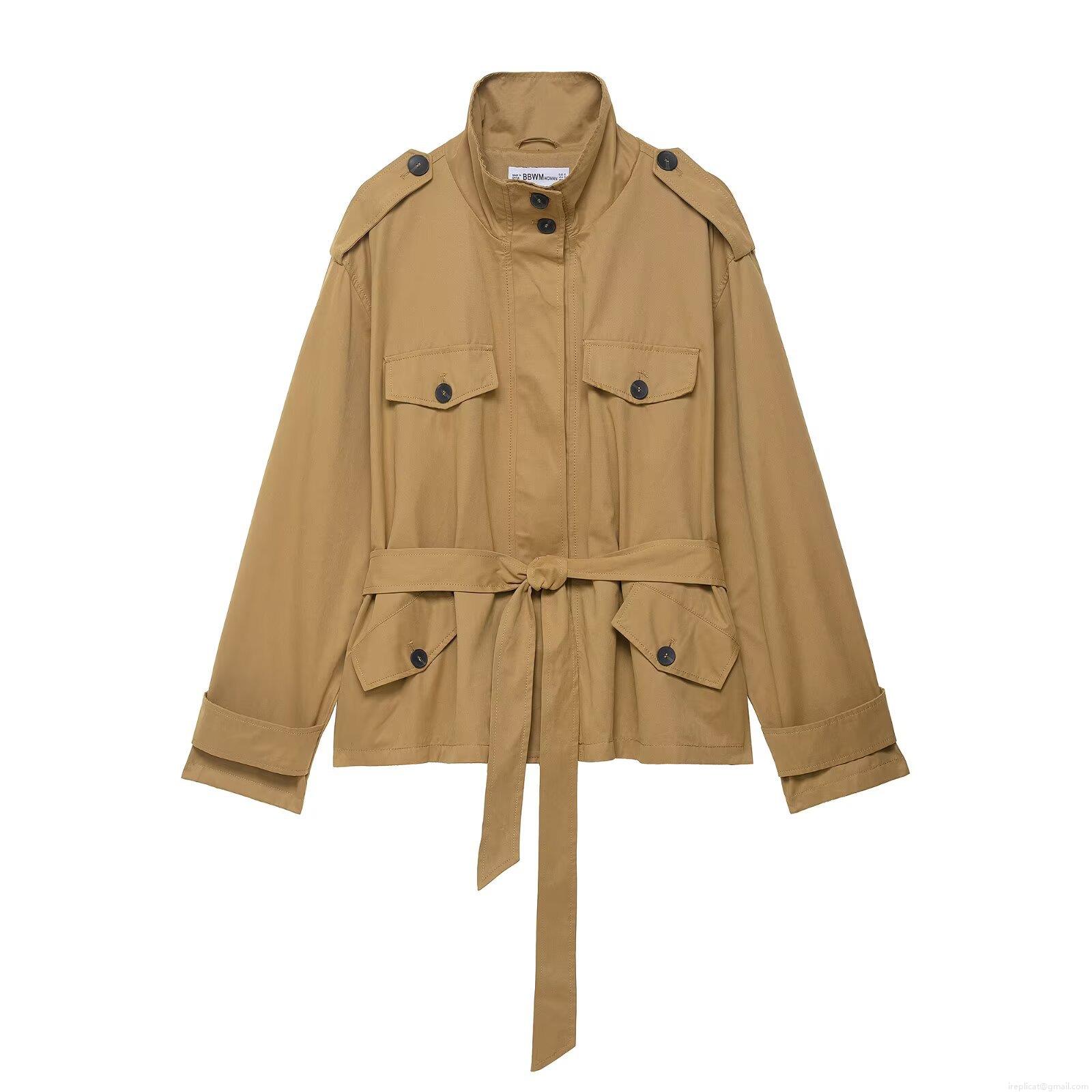 • Women's 2-Piece Khaki Polyester Set Streetwear Belted Cropped Trench Jacket With Multi Pockets And High Waist Button Decorated Shorts Casual Autumn Outfit