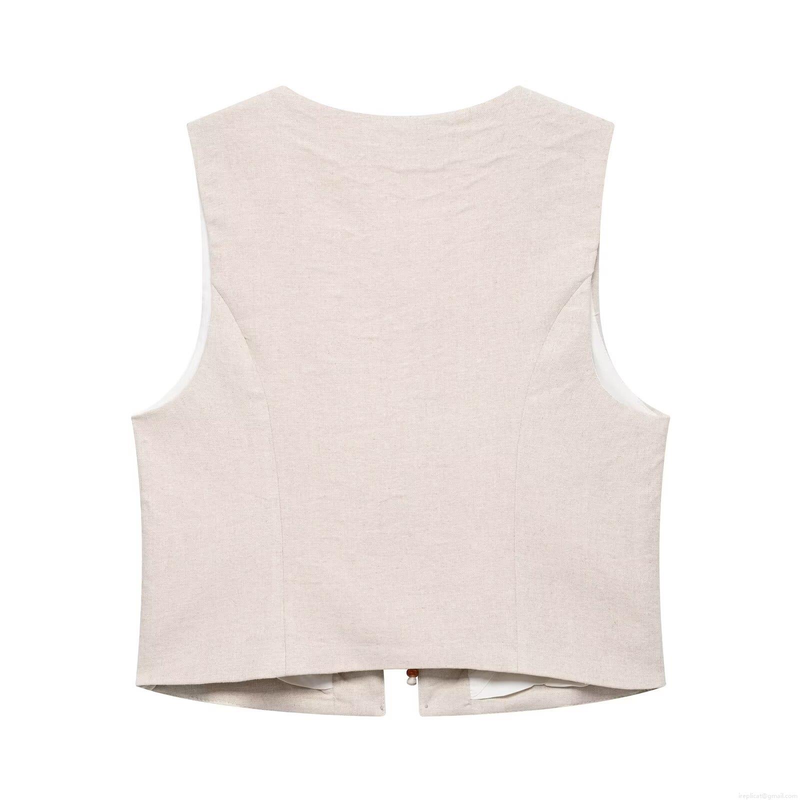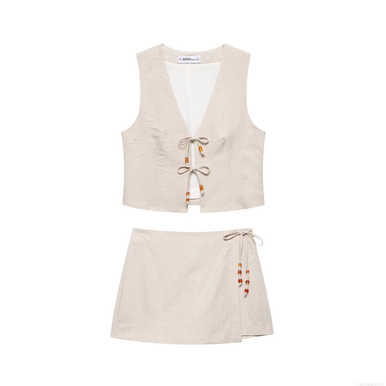 • Women's 2-Piece Summer Set Sleeveless V-Neck Lace-Up Vest And Shorts Suit Beaded Linen-Textured Polyester Plain Casual Streetwear Outfit Beige