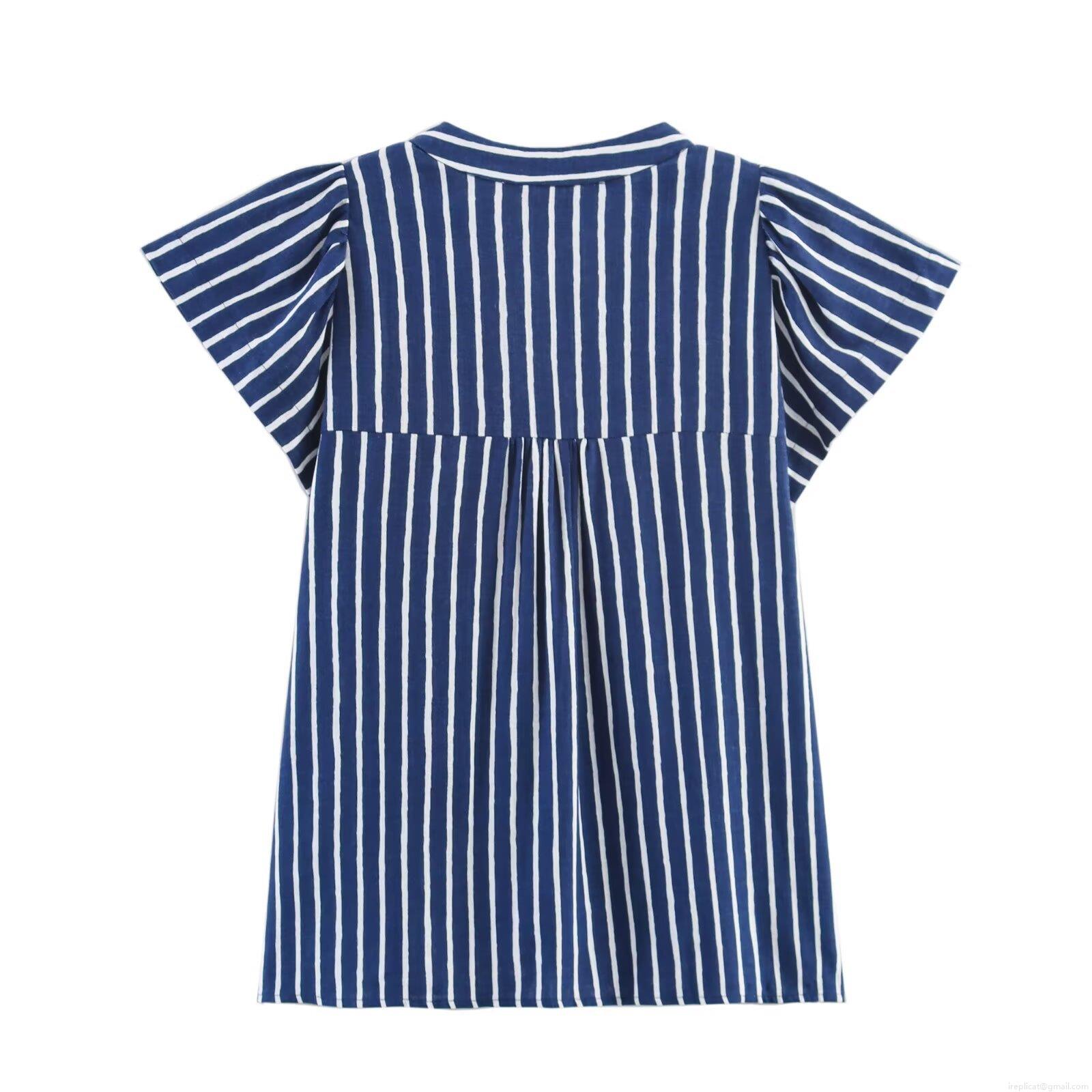 Women's Blue White Stripe Two Piece Set V Neck Fly Sleeve Shirt Top and High Waist Shorts with Gold Buttons Summer Autumn Casual Outfits