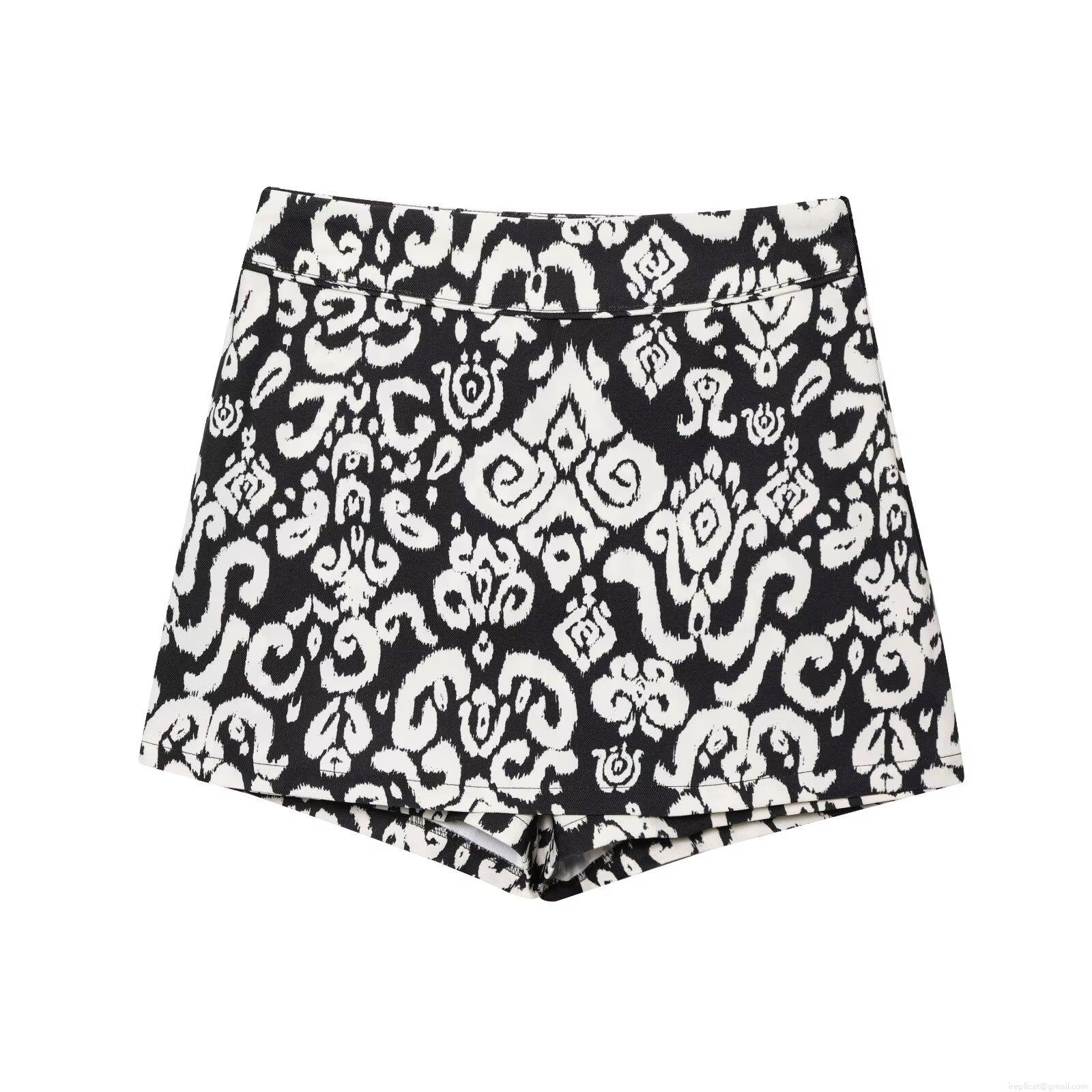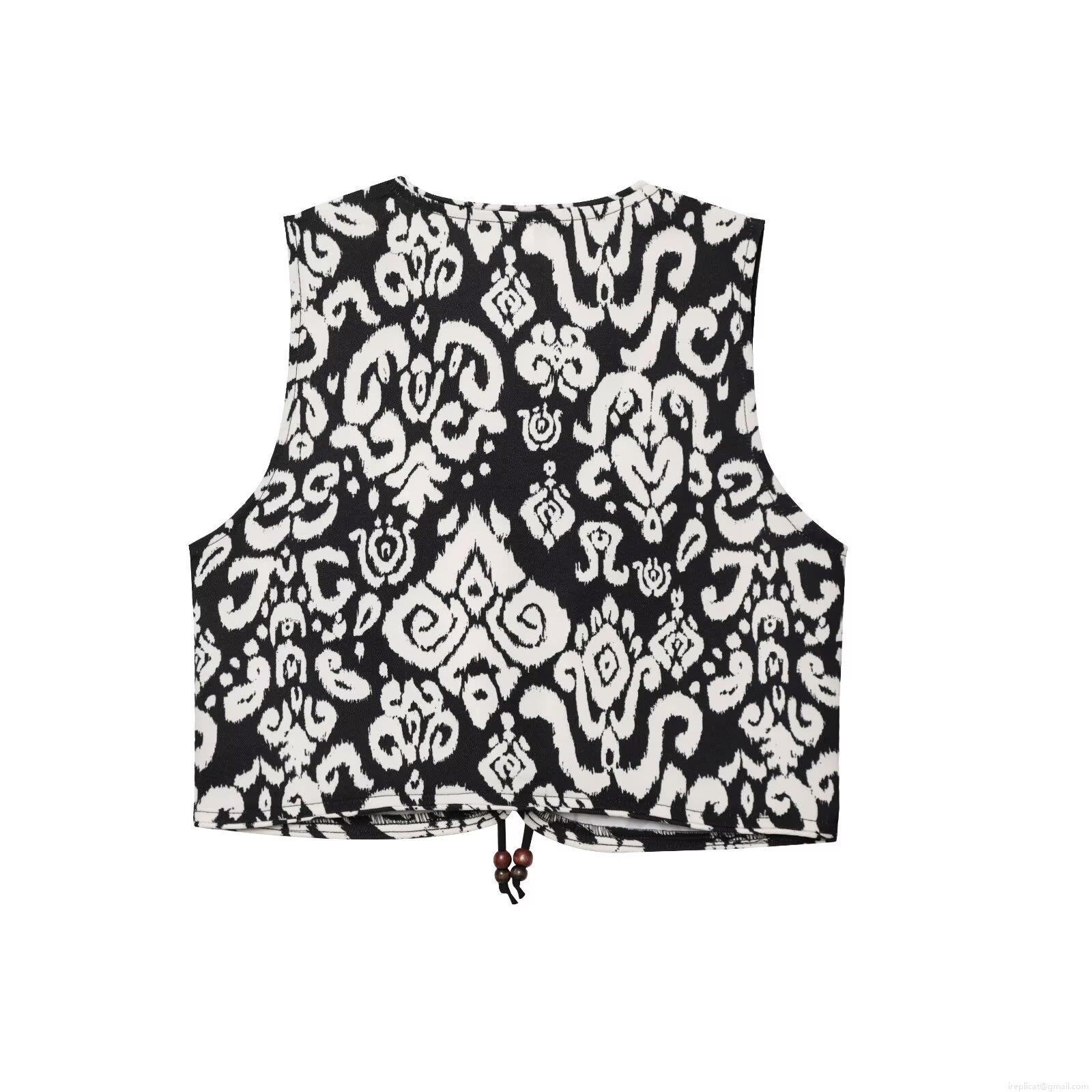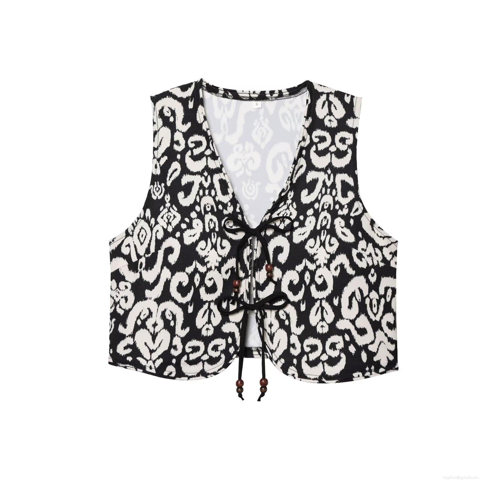 • Women's Bohemian Two Piece Set Black and White Ethnic Print V-Neck Tie Up Crop Top and High Waist Shorts Culottes with Wooden Beads Summer Vacation Outfit
