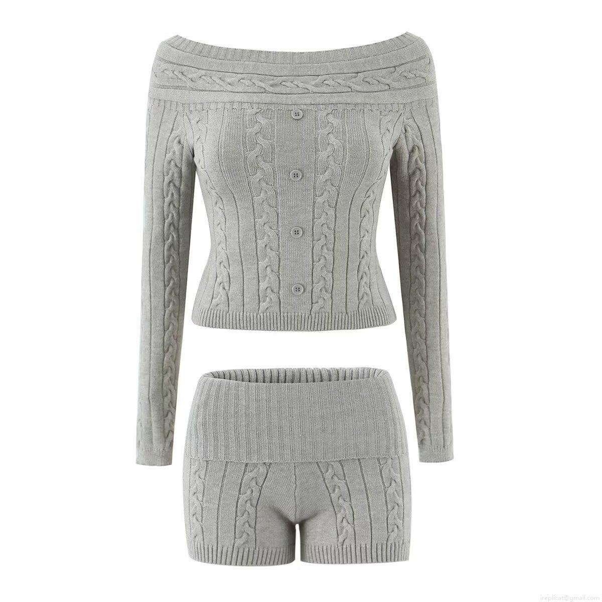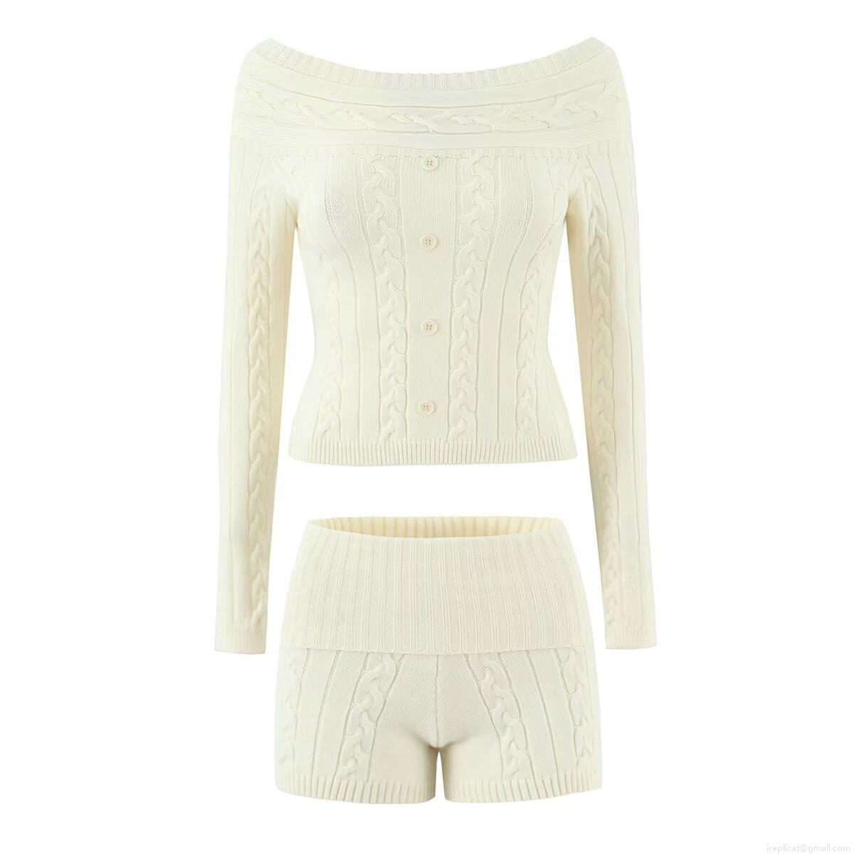 • Women's Cable Knit 2 Piece Set Off Shoulder Button Long Sleeve Sweater And High Waist Shorts Knitted Polyester Blend Lounge Outfit For Casual Party Streetwear