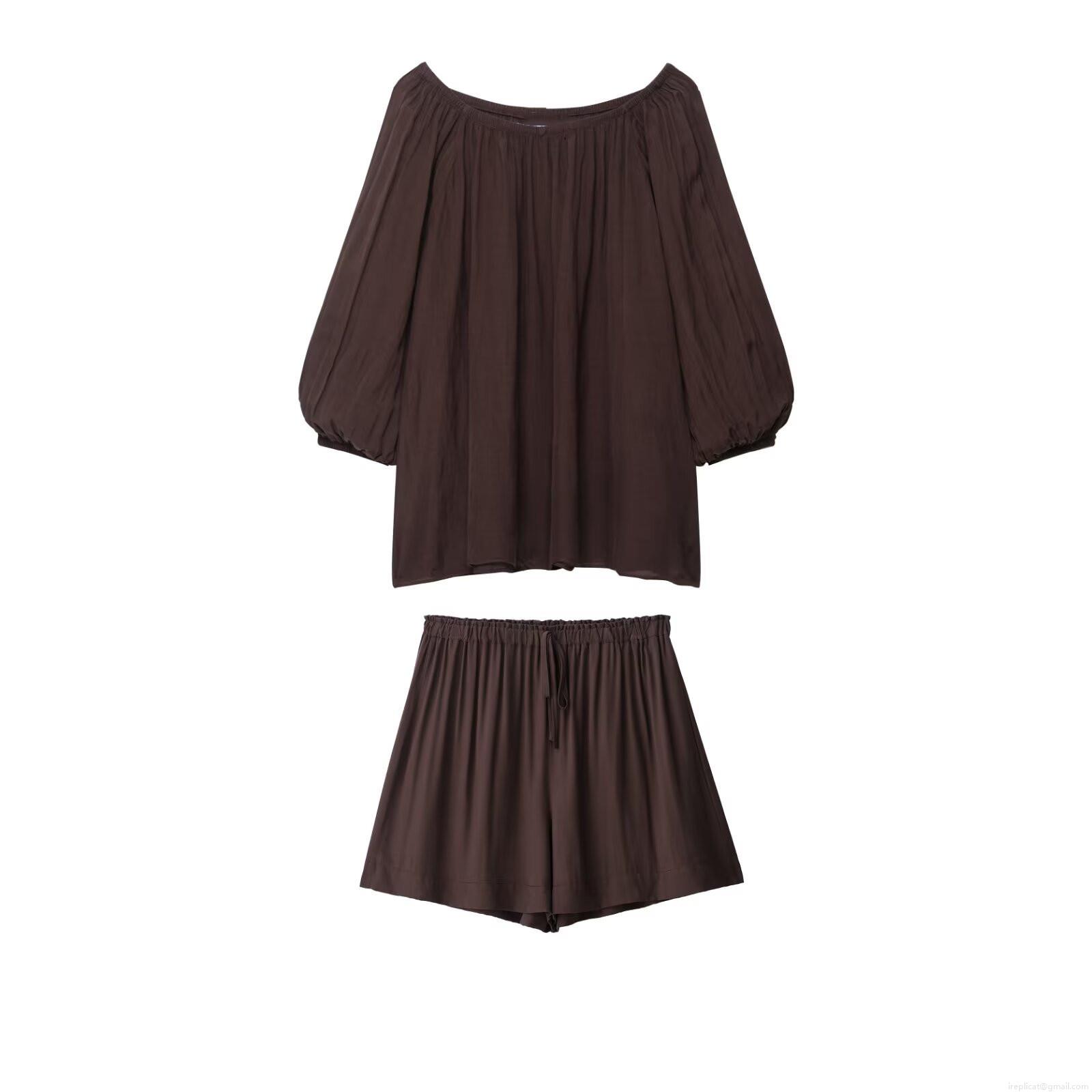 • Women's Casual 2 Piece Outfits Solid Color Slash Neck Puff Sleeve Top And Drawstring Elastic Waist Shorts Loungewear Summer Set For Women