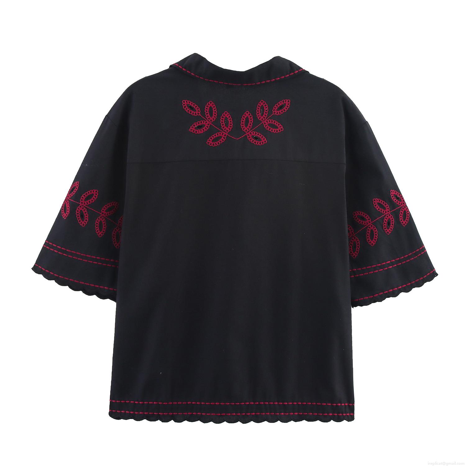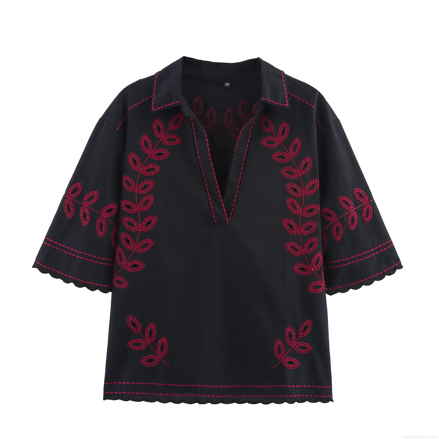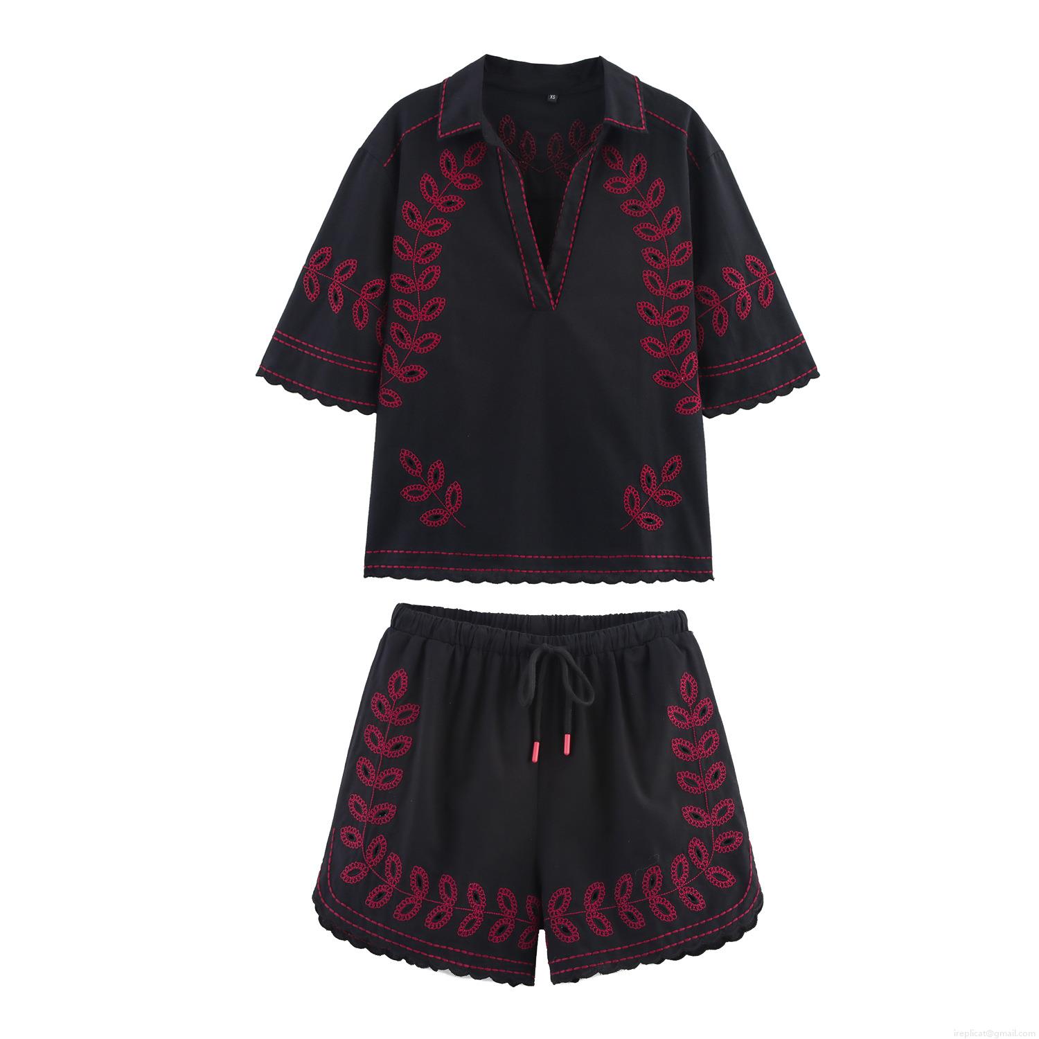 • Women's Casual Cotton Blend Embroidered Shirt And Shorts Set Two Piece Outfits V Neck Short Sleeve Top With Scalloped Edge Drawstring Shorts Black Red Floral Embroidery