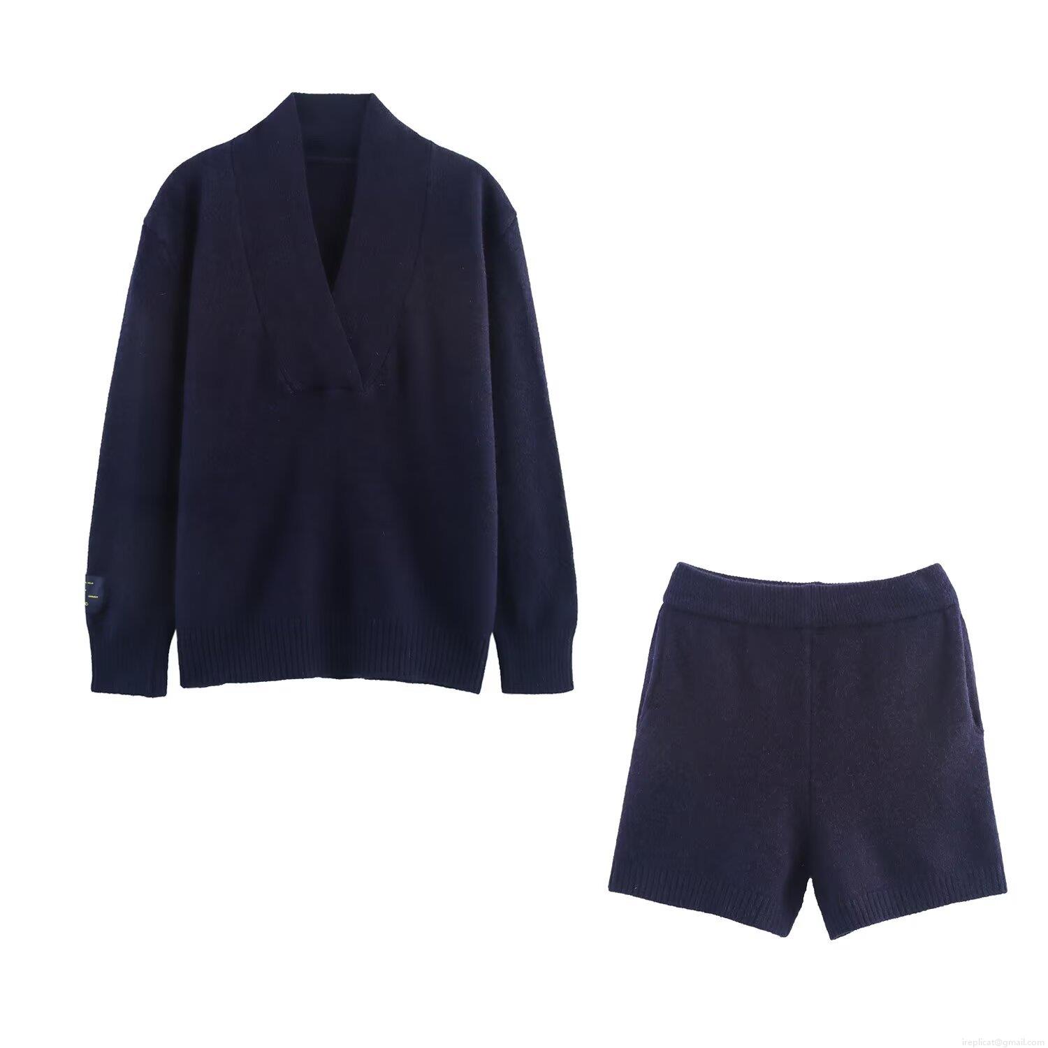 • Women's Casual Knit 2 Piece Set V Neck Long Sleeve Pullover Polyester Sweater And High Waist Ribbed Shorts Solid Color Knitted Tracksuit For Women Streetwear