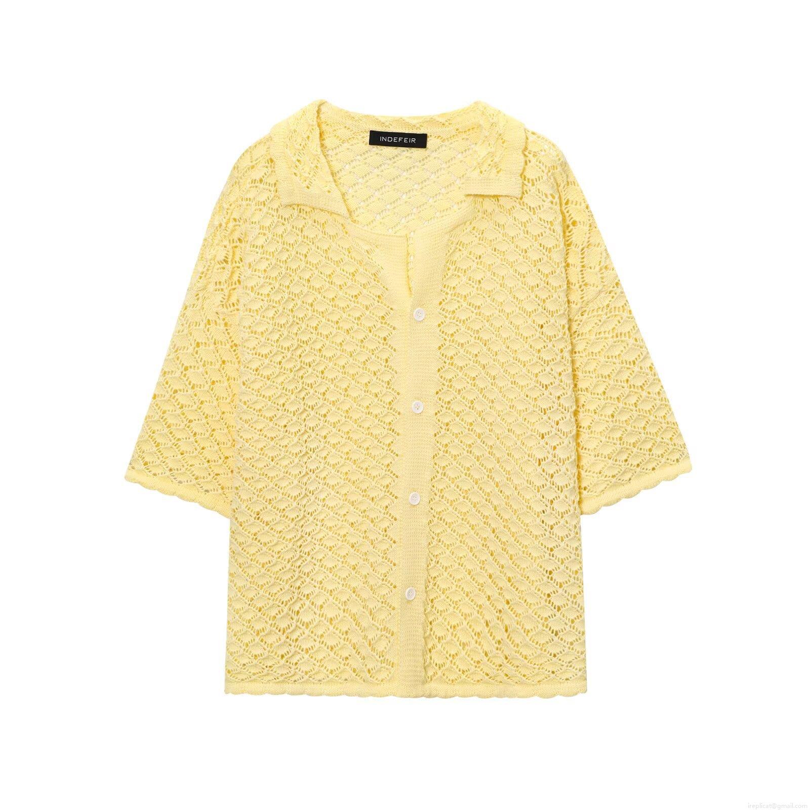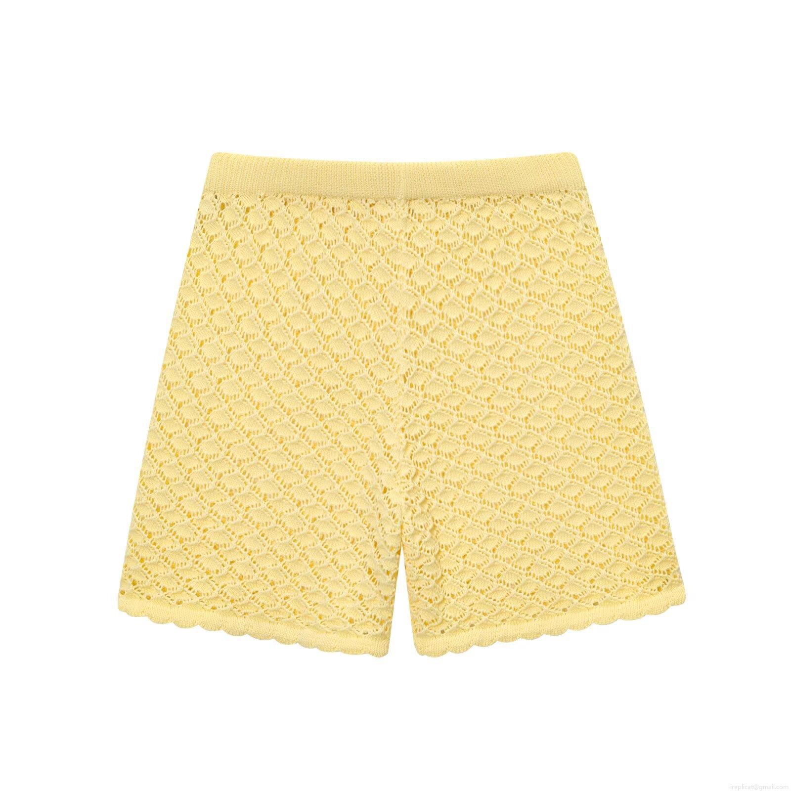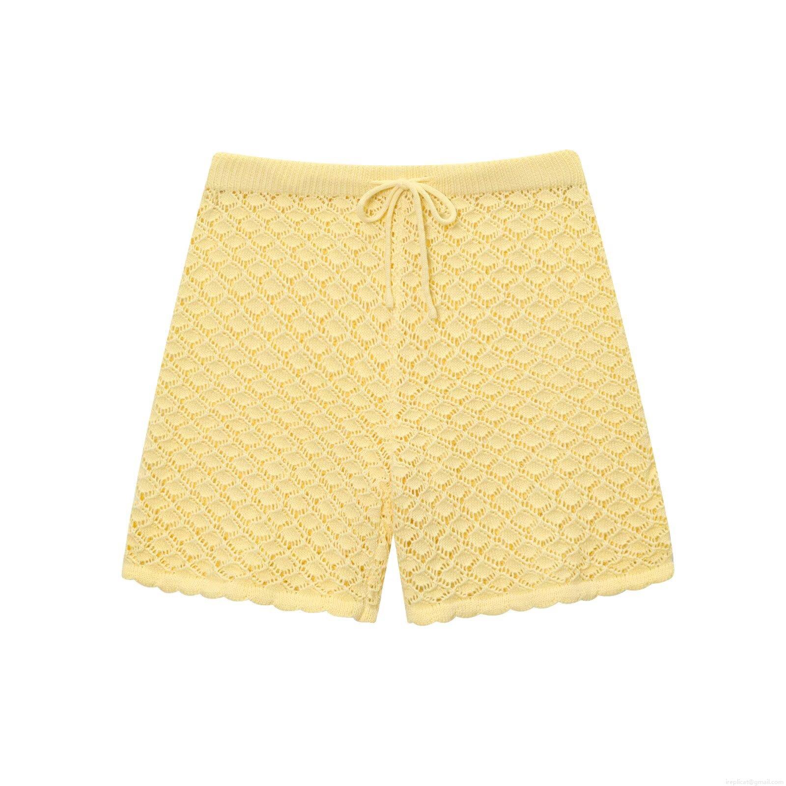 • Women's Casual Two Piece Knit Set Hollow Out Crochet Short Sleeve Cardigan And Drawstring Shorts Polyester Western Streetwear Oversized Yellow Outfit