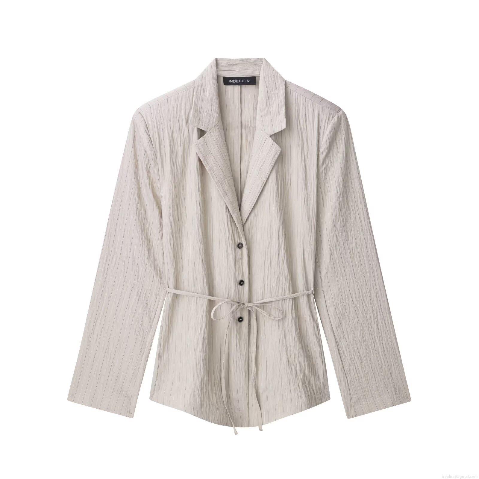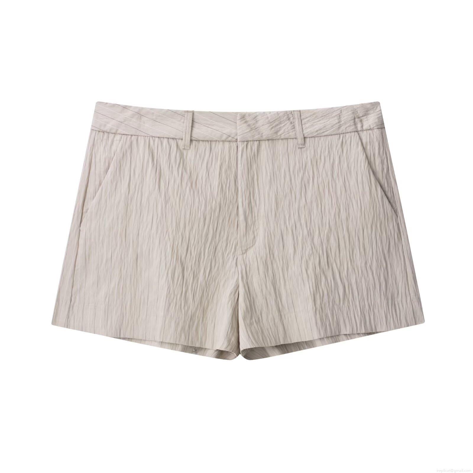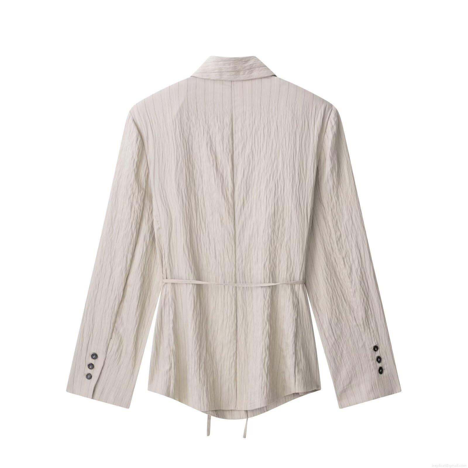• Women's Casual Two Piece Outfits Pleated Blazer And Shorts Set Crinkled Vertical Stripe Texture Drawstring Waist Blazer With Matching Pockets Shorts Streetwear Office Lady Beige Grey