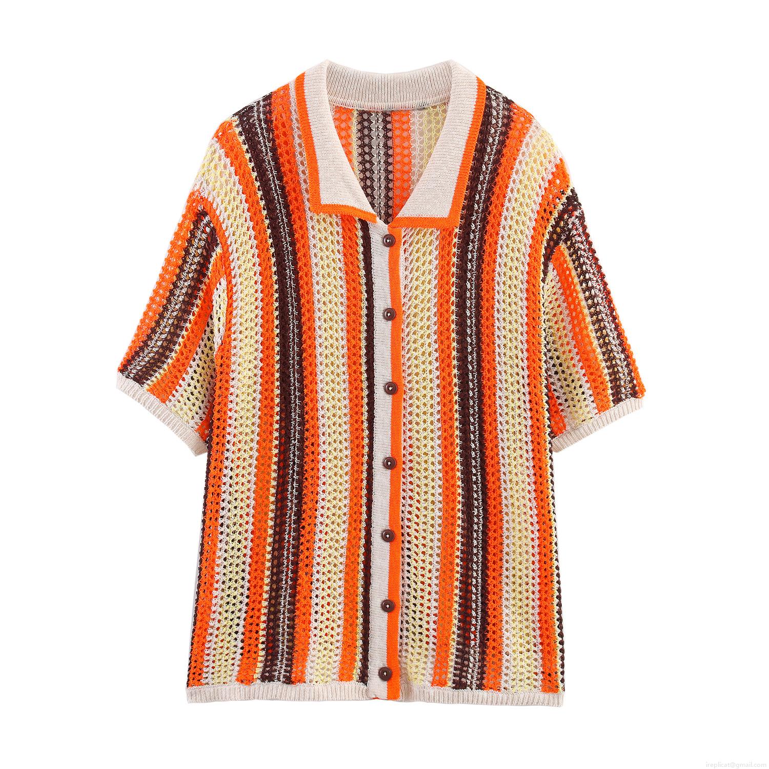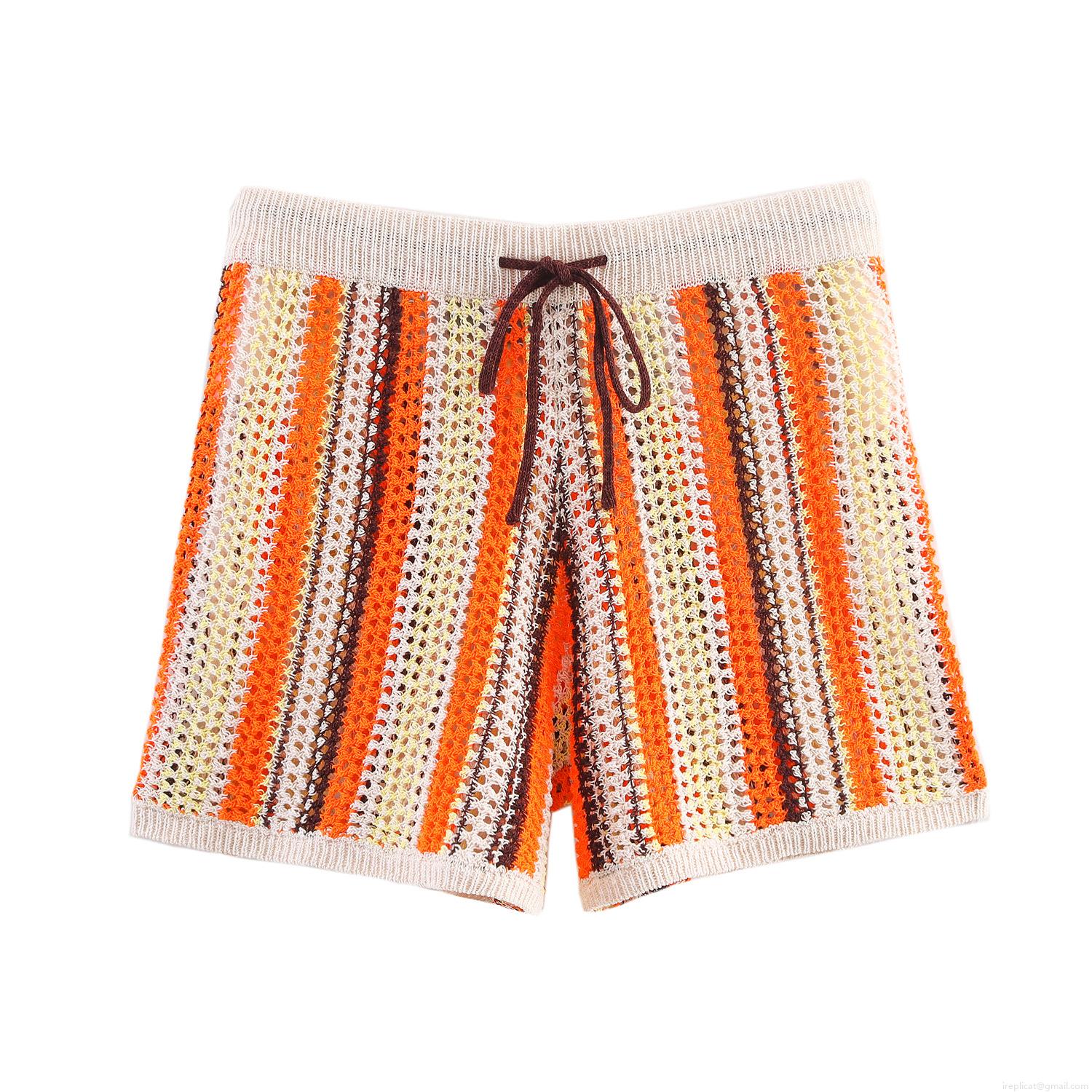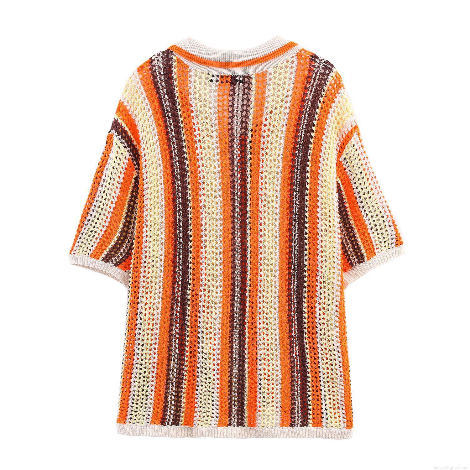 • Women's Colorful Stripe Hollow Out Knit Two Piece Set Short Sleeve Button Up Polo Shirt And Elastic Waist Drawstring Shorts Casual Summer Beach Outfits