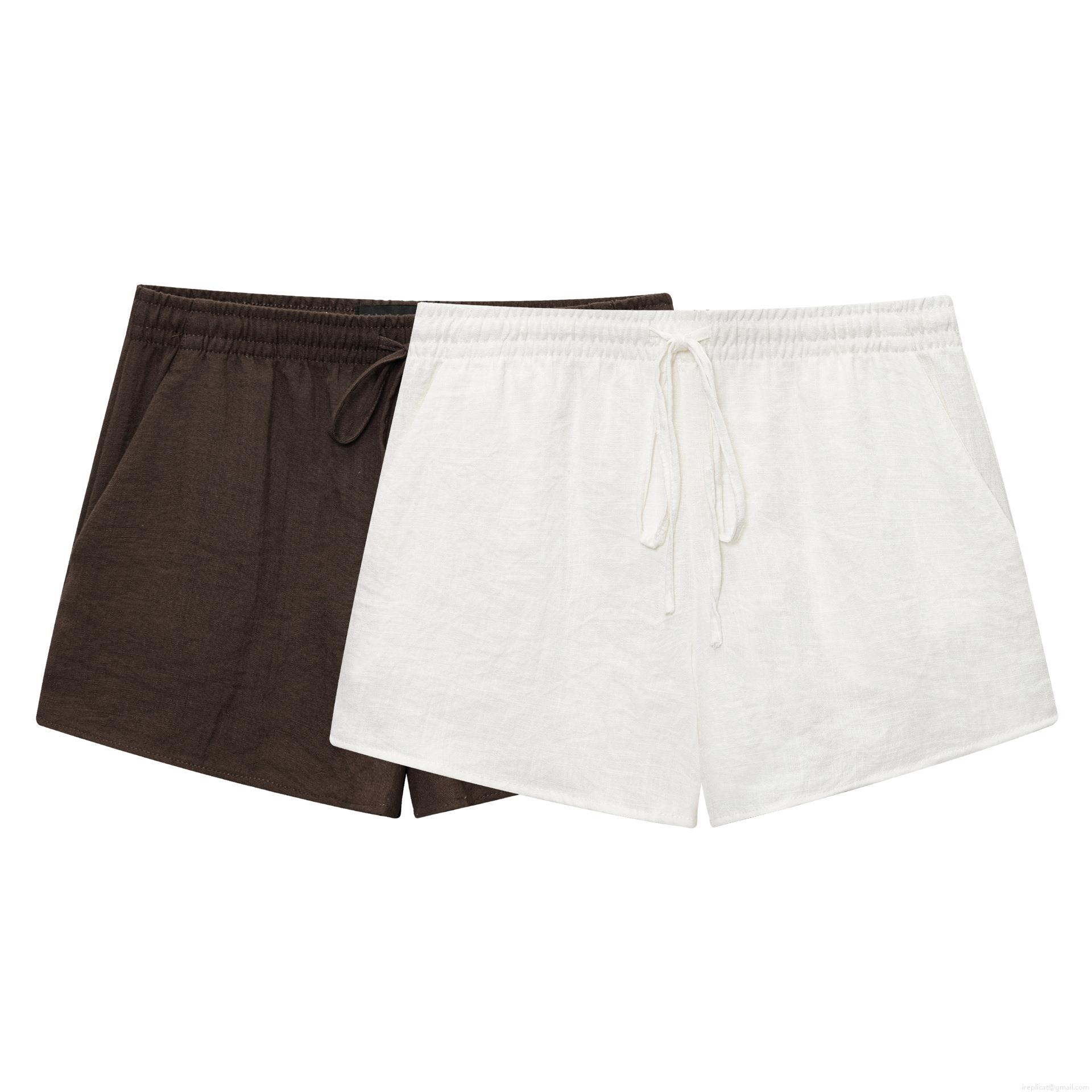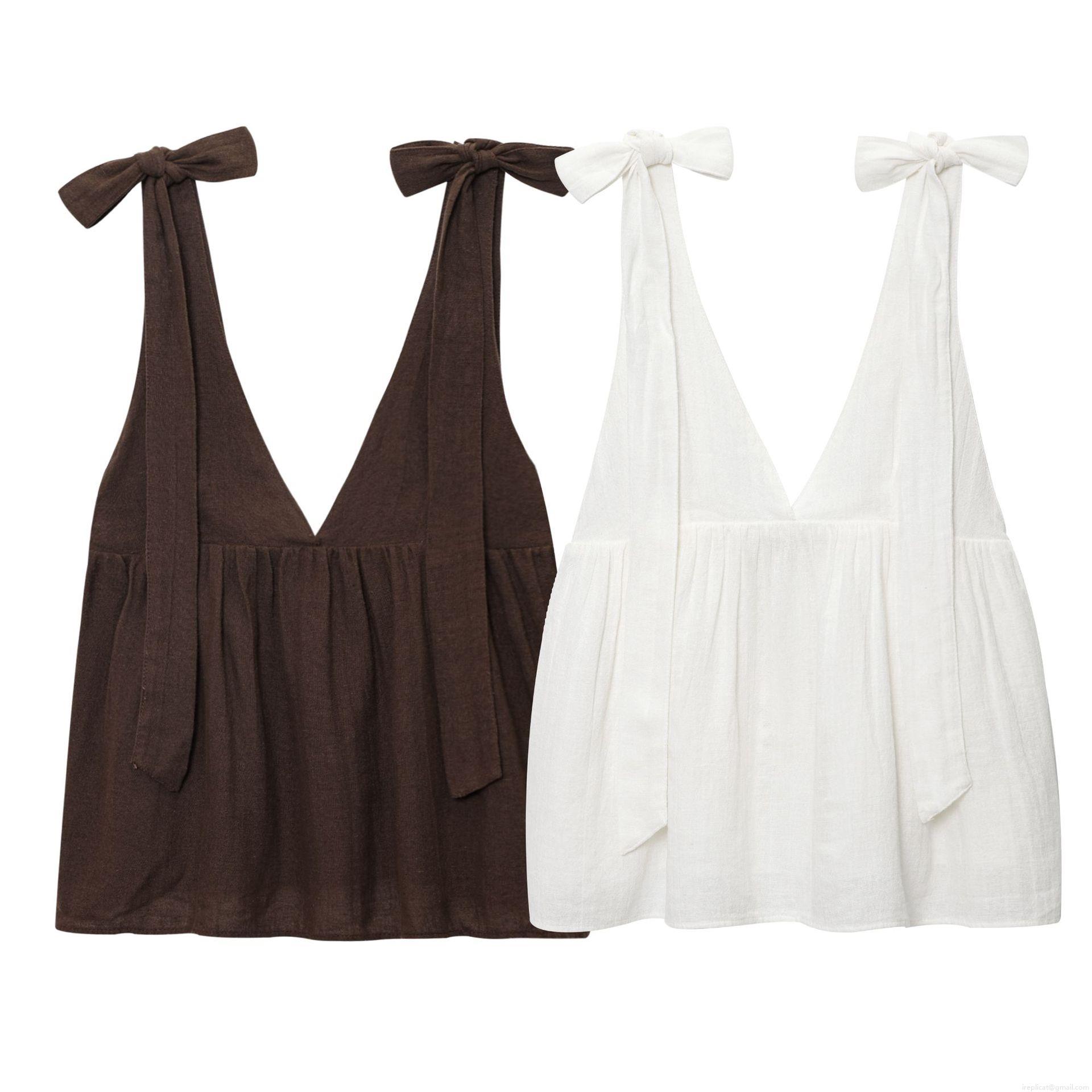 • Women's Cotton Linen Shorts Set Bow Tie Strap Camisole V Neck Top And Drawstring Smocked Waist Shorts Two Piece Summer Vacation Casual Outfit