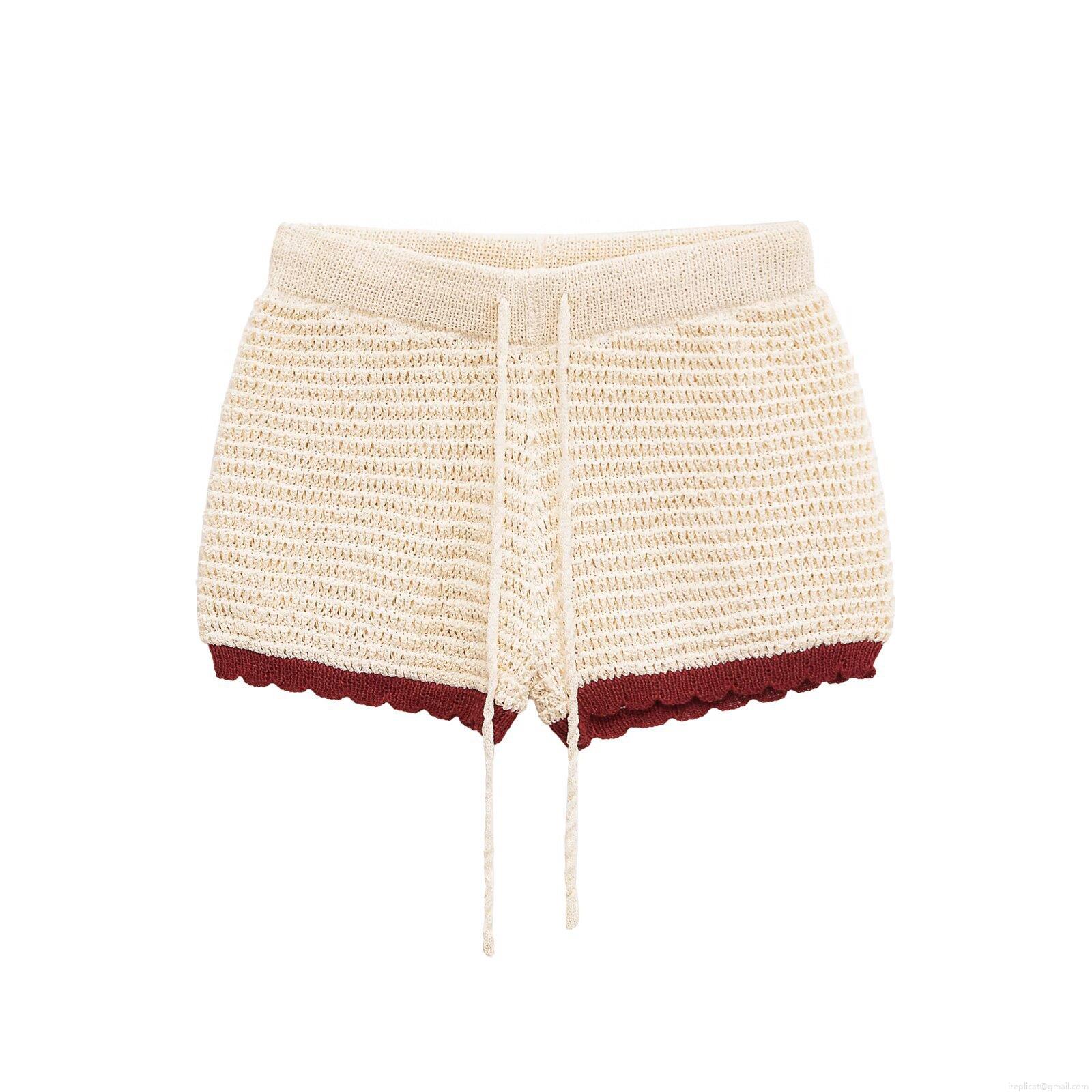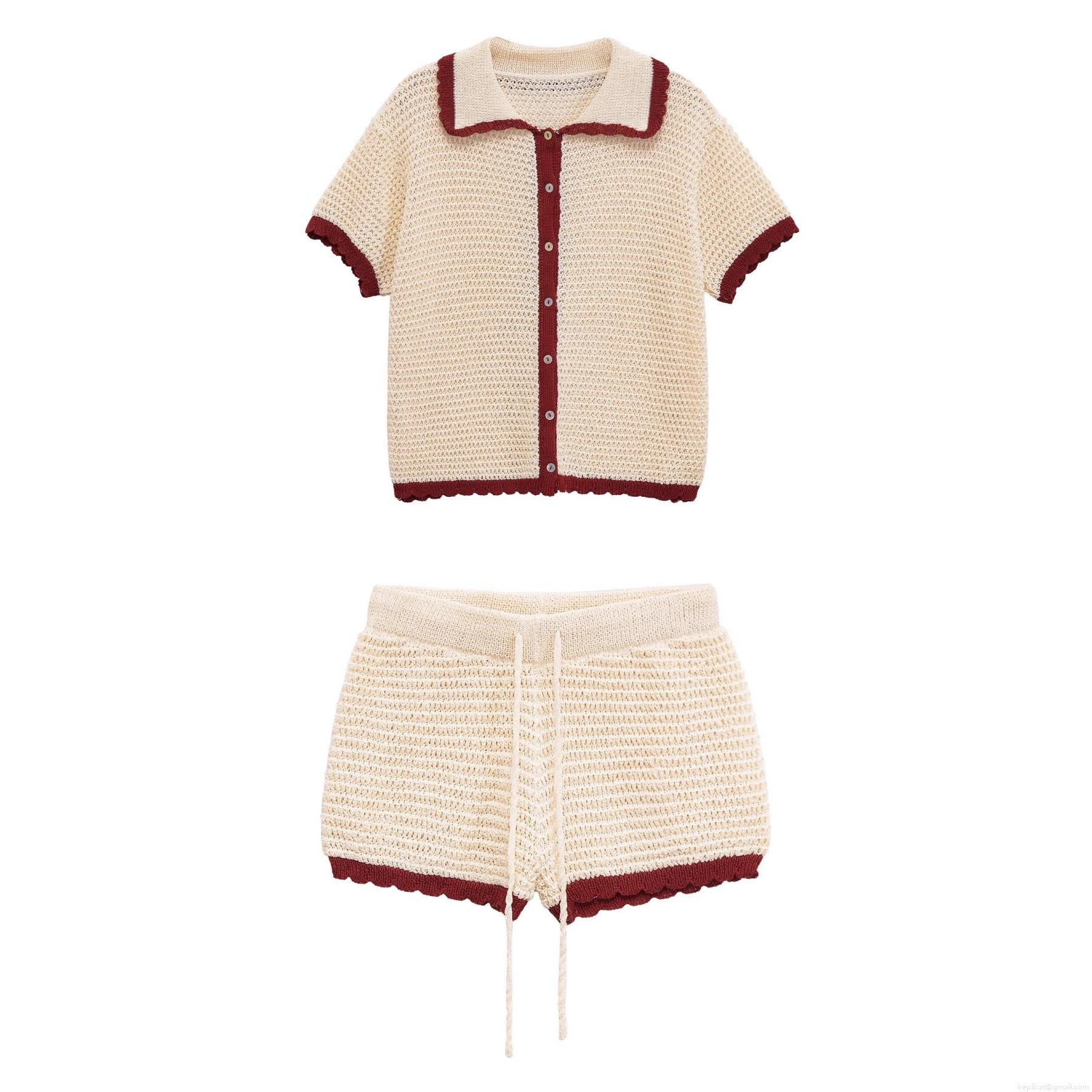 • Women's Crochet Knit Two-Piece Set Hollow Out Polo Short Sleeve Cardigan And Drawstring Shorts Wavy Trim Contrast Color Retro Style Summer Outfit