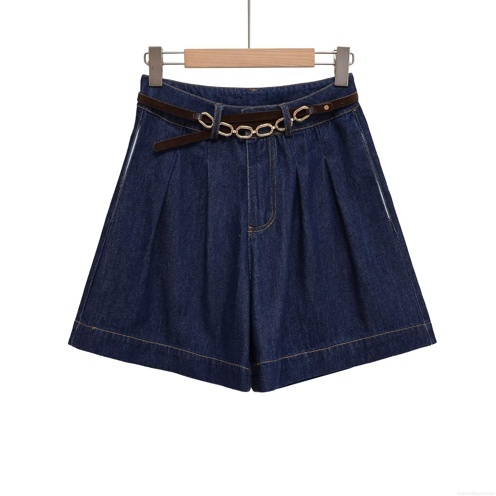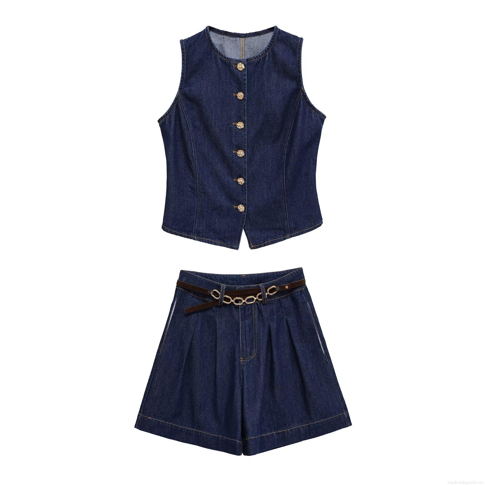 • Women's Denim Two Piece Set Sleeveless Round Neck Vest With High Waist Wide Leg Shorts Summer Fashion Casual Streetwear Jeans Suit With Belt