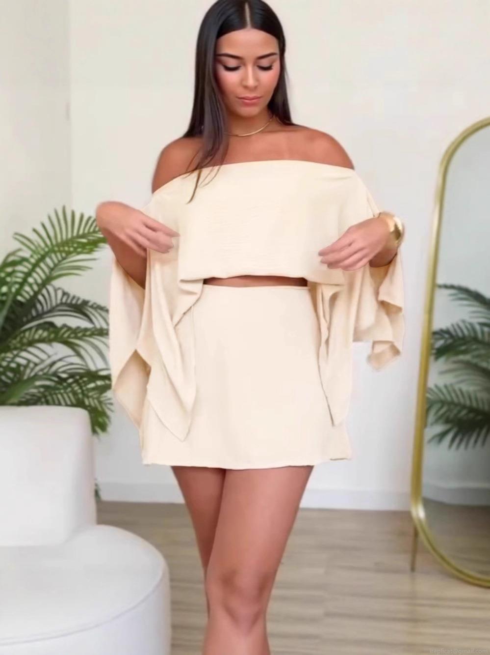 • Women's Elegant Off-Shoulder Two-Piece Set Asymmetric Slit Sleeve Top And High Waist Shorts Solid Color Summer Vacation Commuter Skirt Set With Belt