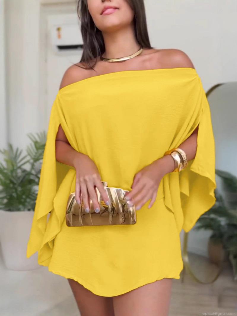 Solid Color, Off-shoulder, High-waisted, Split Design, Shawl Sleeves, Belt, Asymmetrical Cut, Cape Sleeves
