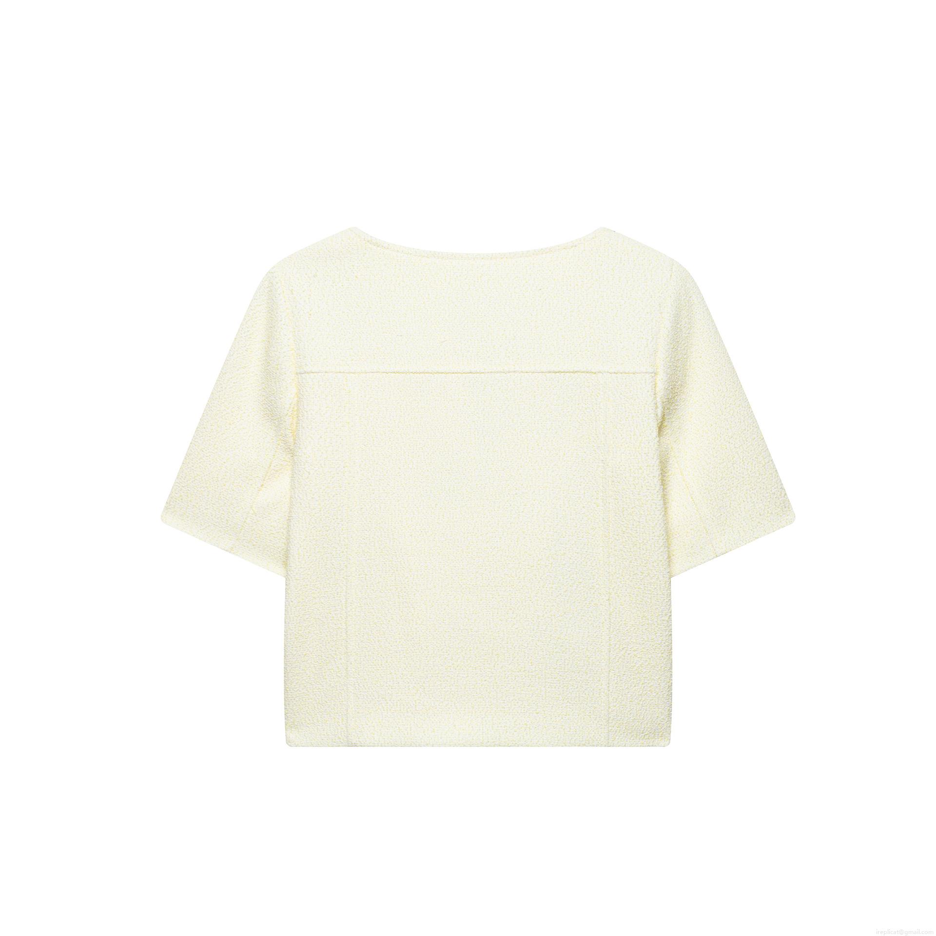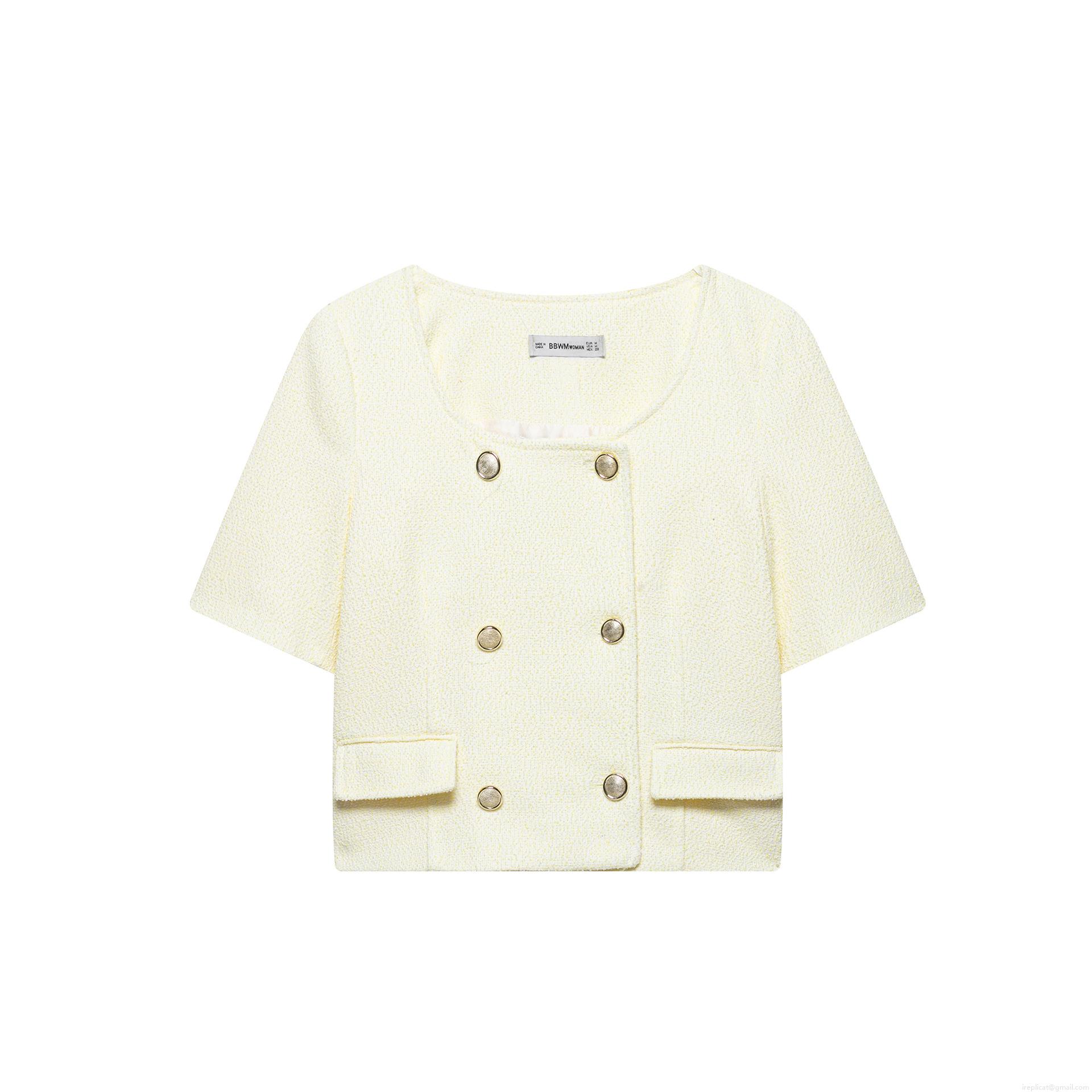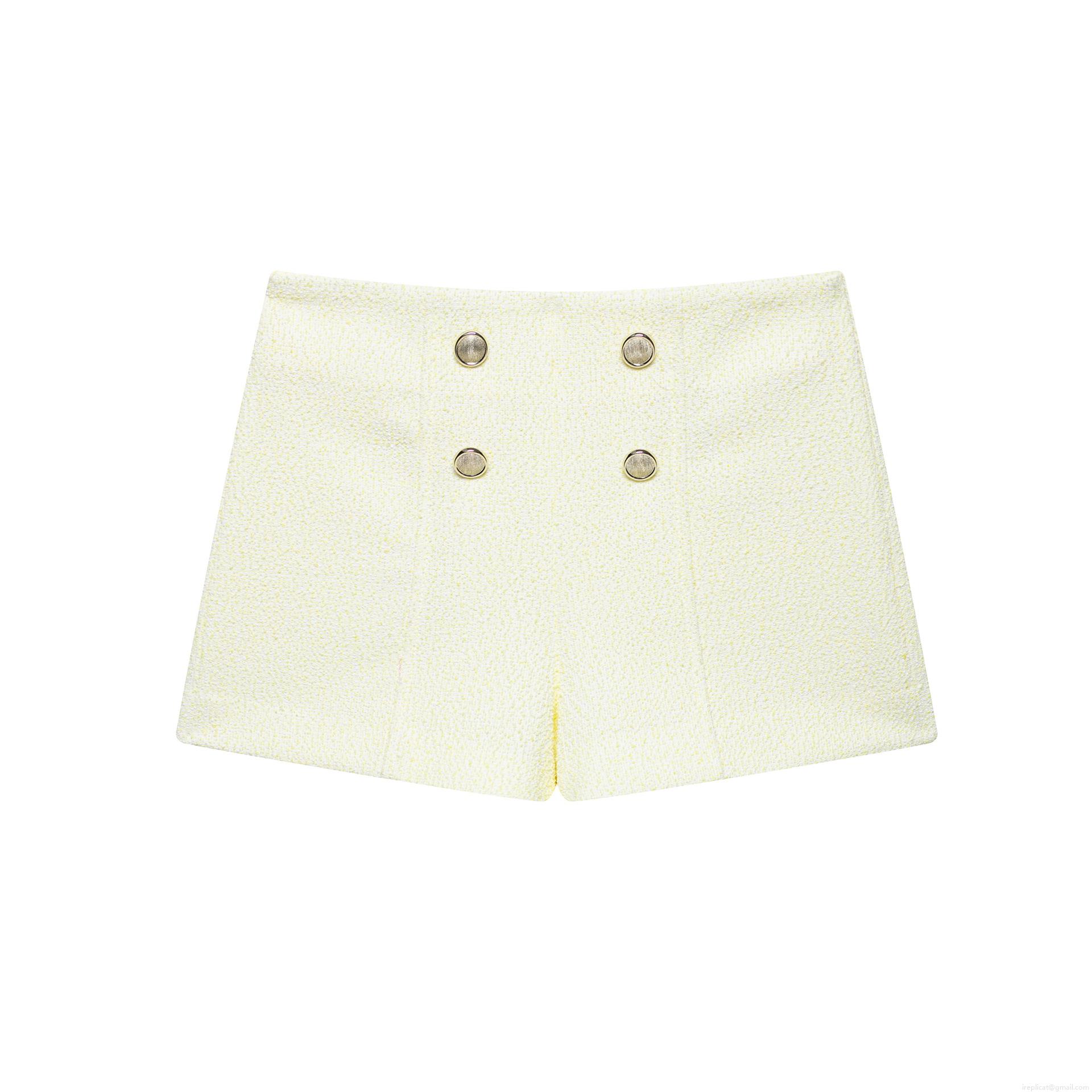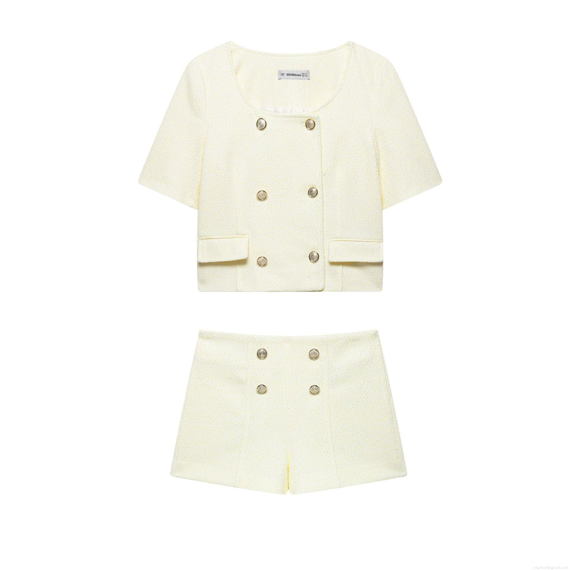 • Women's Elegant Pale Yellow Tweed Two Piece Set Short Sleeve Double Breasted Blazer And High Waist Shorts With Gold Buttons Office Lady Suit