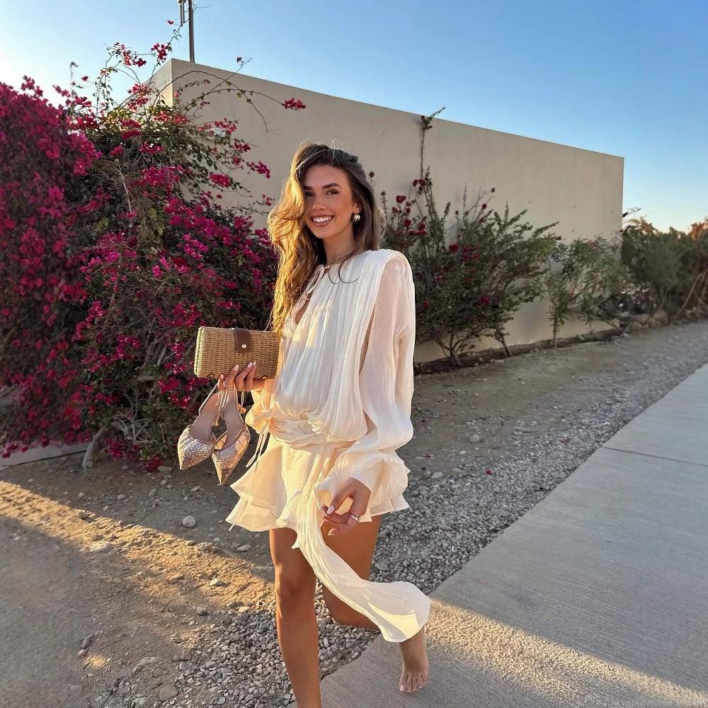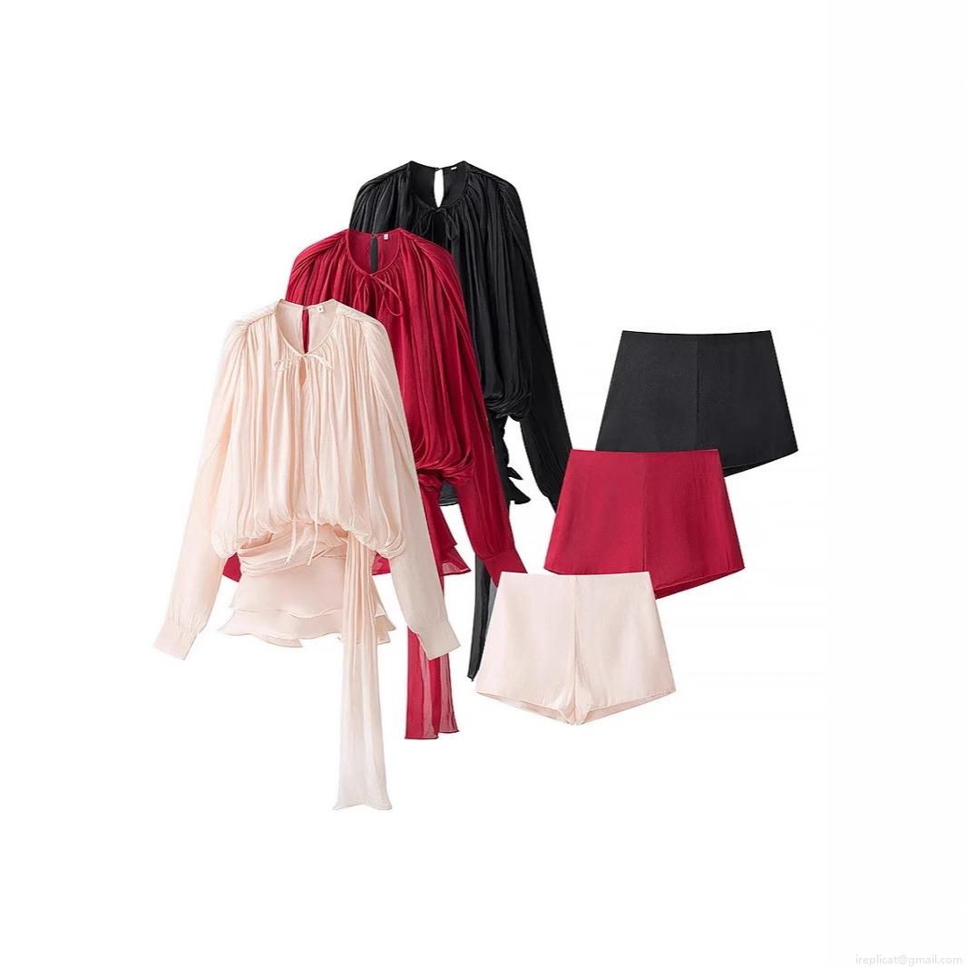 • Women's Elegant Pleated Two-Piece Set Long Sleeve V-Neck Ruffle Satin Top and Shorts Solid Color Casual Vacation Outfits Fashion Summer Spring Co-ord Sets for Women
