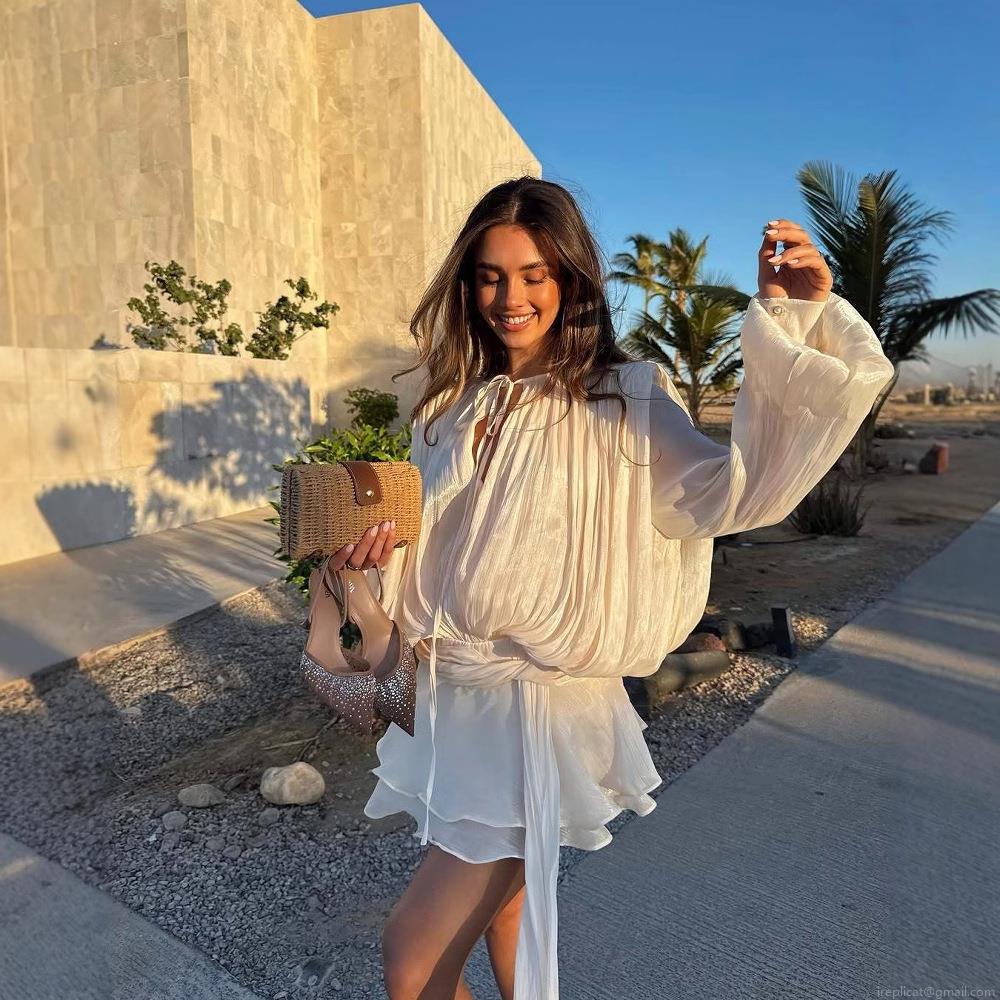 Solid Color, Pleats, Ruffles, V-neck, Lace, Puff Sleeves