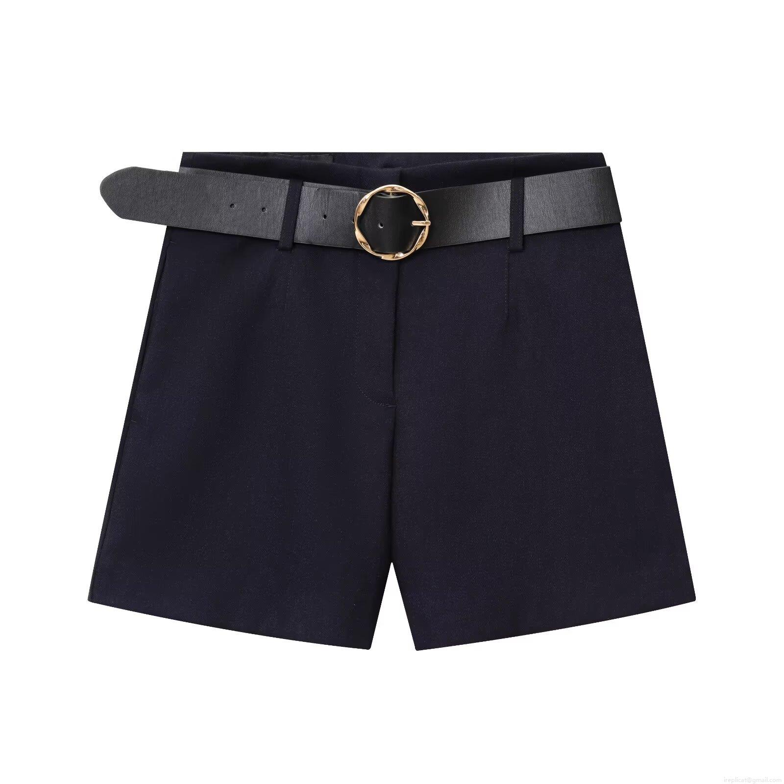 Women's Fashion Navy Blue Golden Button Cropped Blazer Jacket And Belted High Waist Shorts Two-Piece Set Polyester London Twill Streetwear Outfit