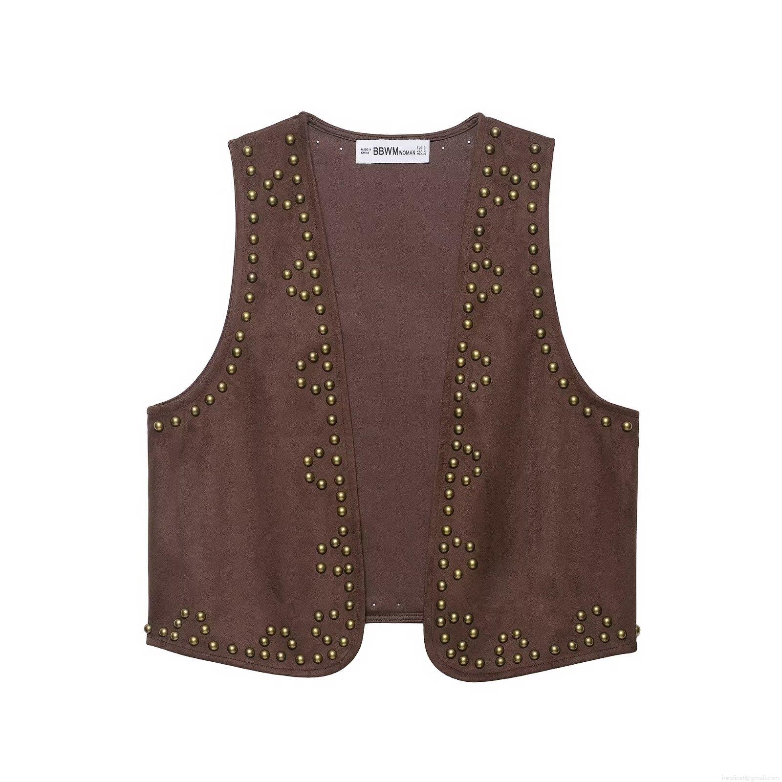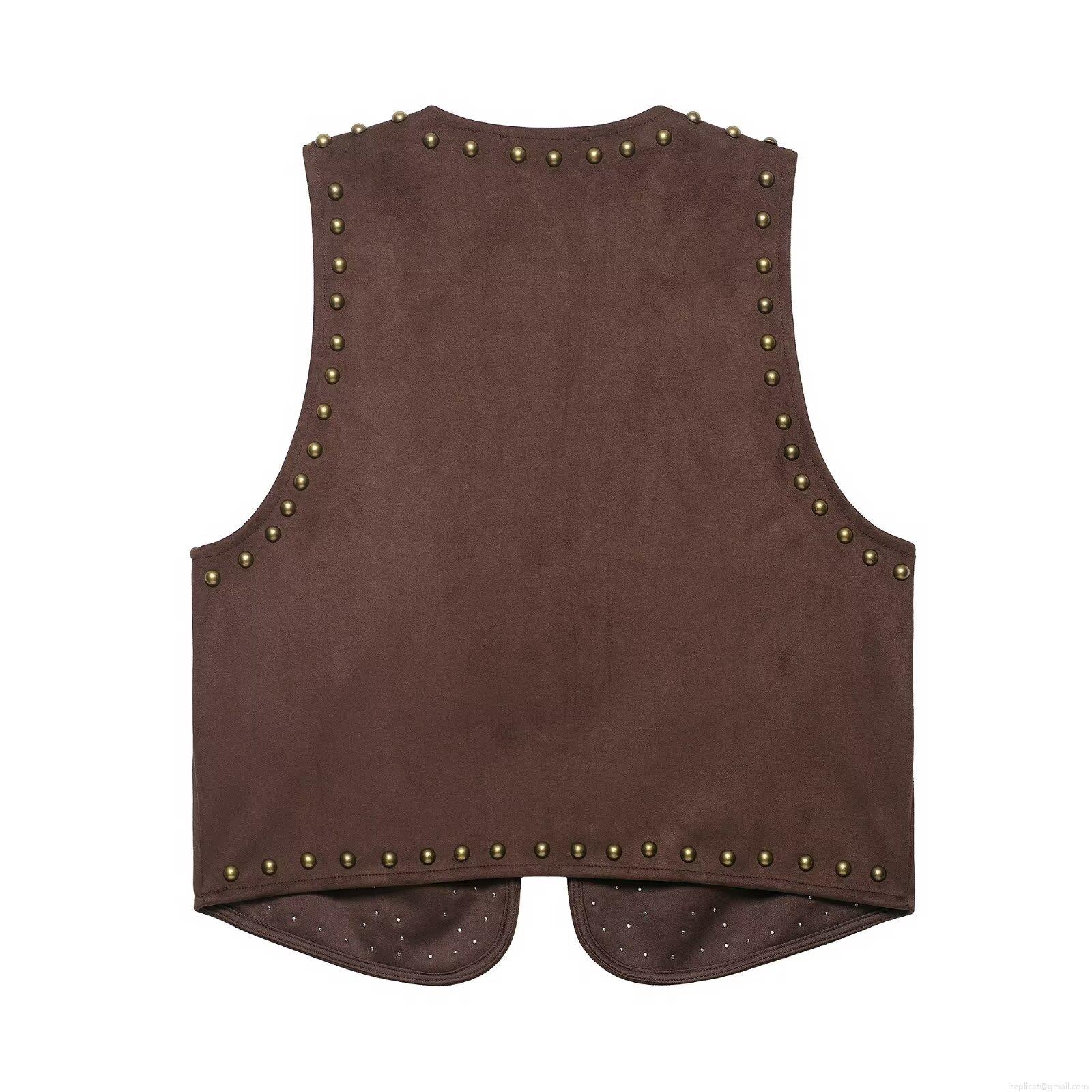 Women's Faux Suede Vest and Shorts Two-Piece Set Retro Western Style Streetwear with Gold Metal Studs Brown Casual Sleeveless Outfit