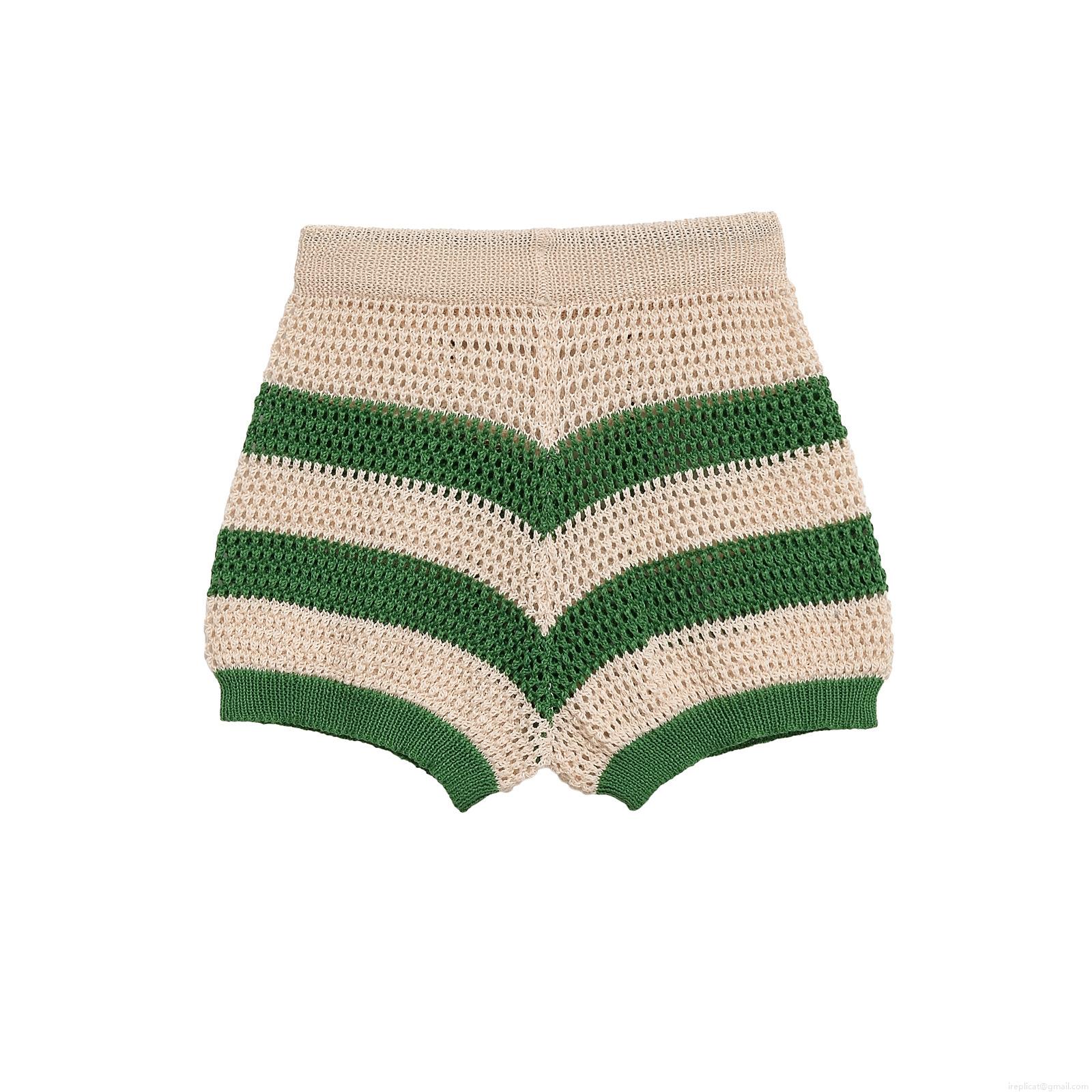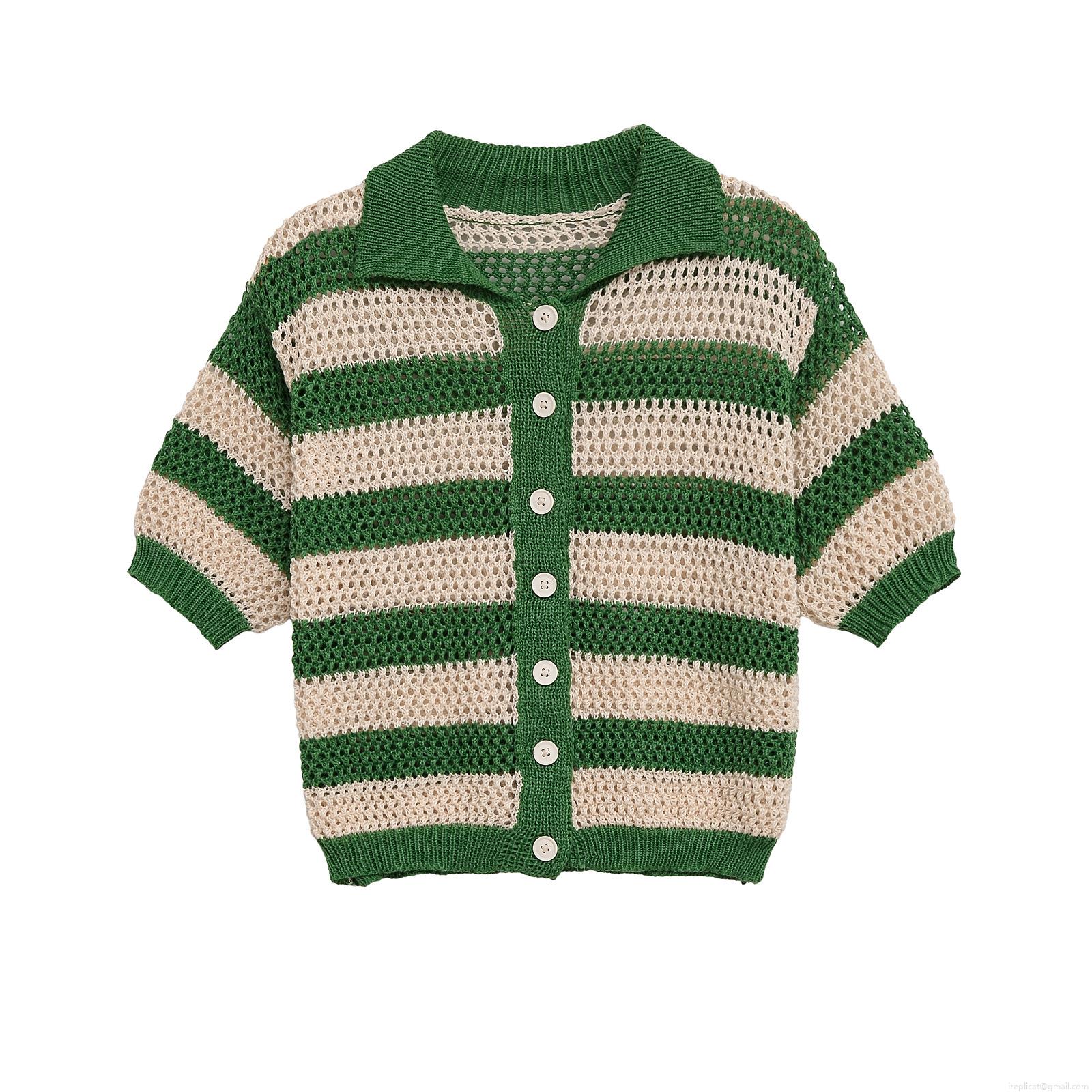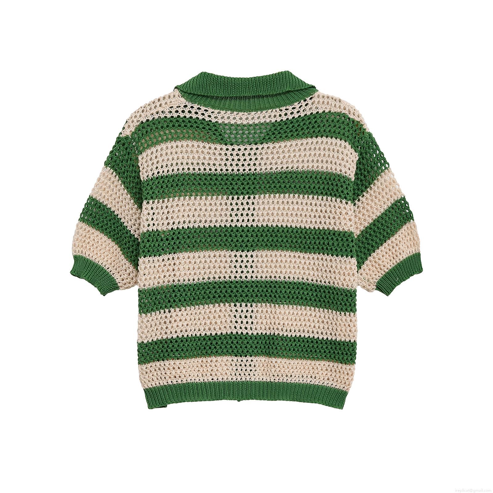 • Women's Hollow Out Crochet Knit Stripe Two Piece Set Short Sleeve Polo Collar Button Up Shirt and Drawstring Waist Shorts Casual Summer Beach Vacation Outfits