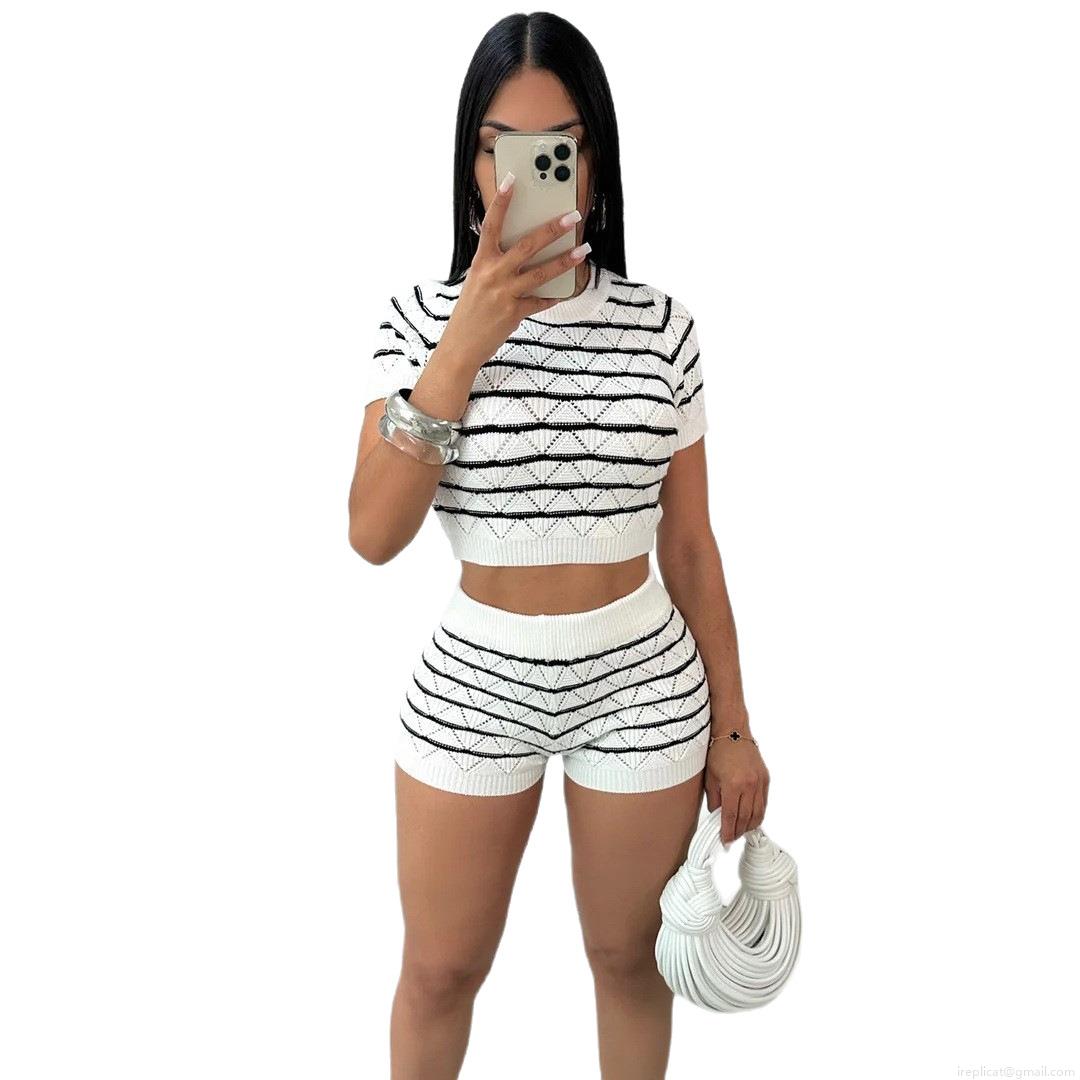 • Women's Knit Two Piece Shorts Set Wavy Striped Round Neck Short Sleeve Crop Top Bodycon High Waist Shorts Summer Casual Beach Outfits