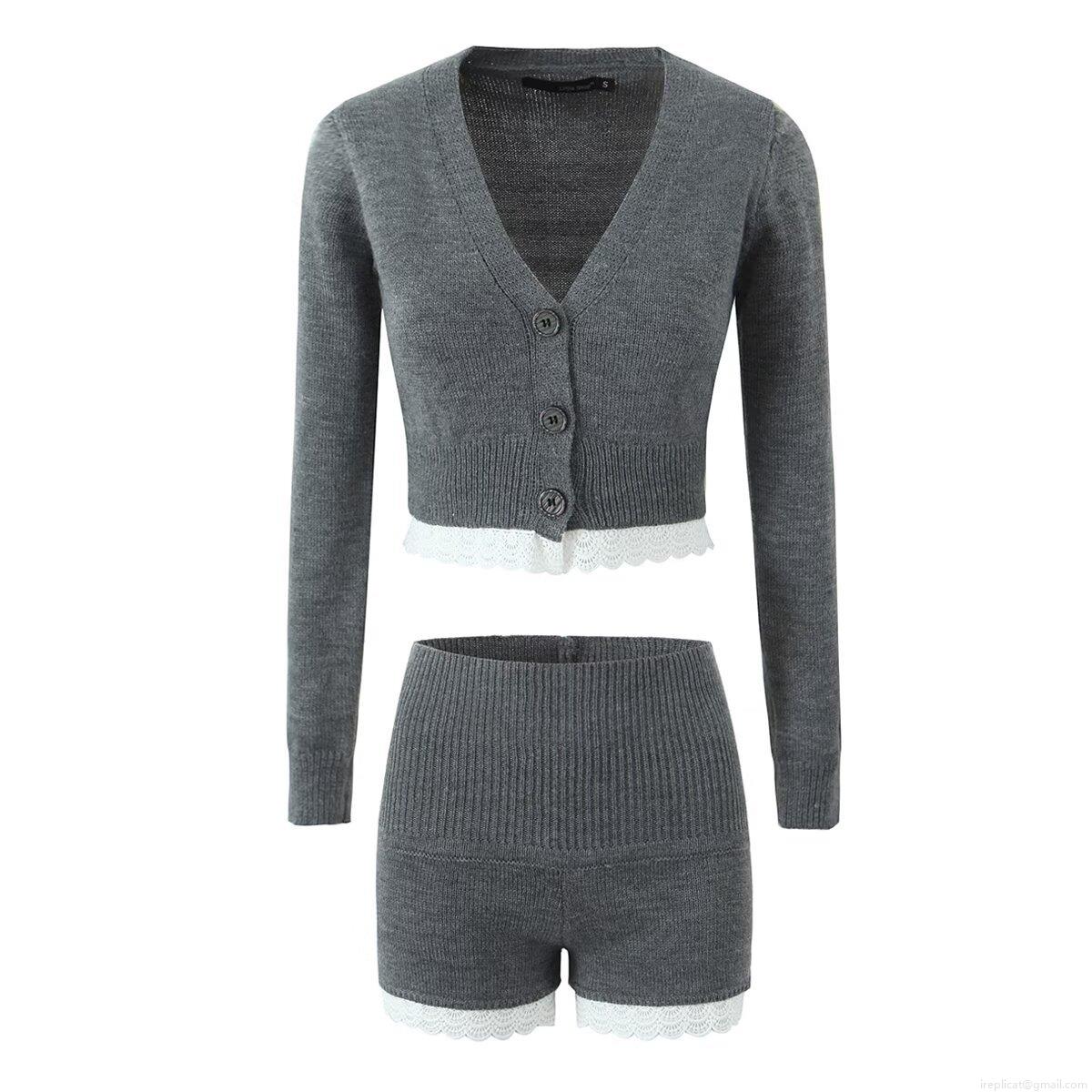 • Women's Knitted Two Piece Shorts Set V-Neck Button Up Cardigan Top High Waist Shorts With White Lace Trim Solid Color Slim Fit Casual Sweatsuit