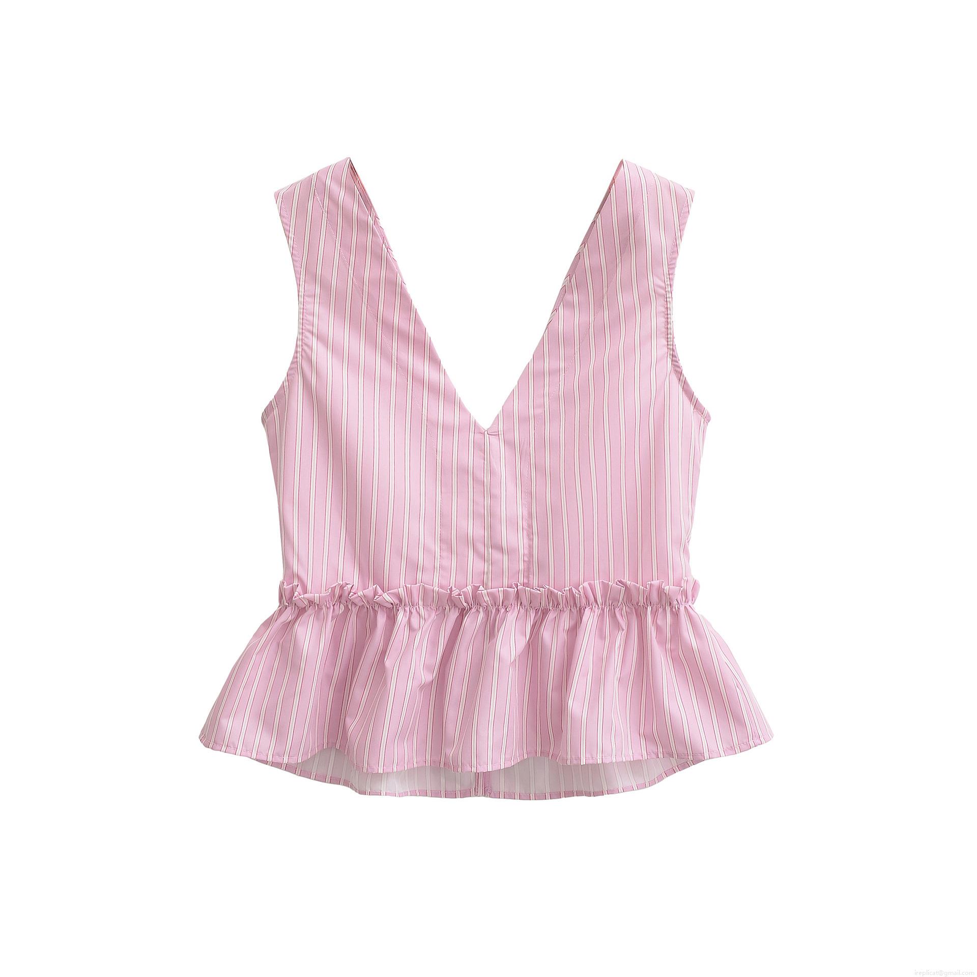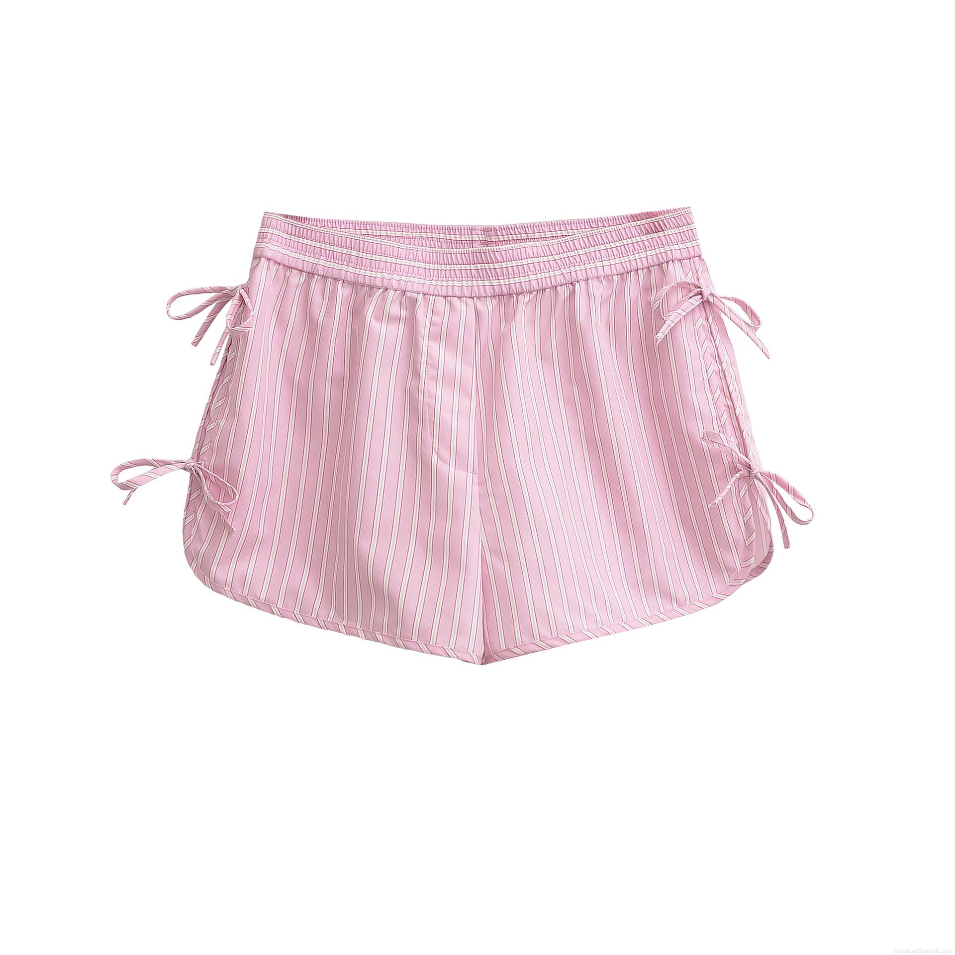 • Women's Pink White Striped V-Neck Sleeveless Top and Shorts Two-Piece Set Summer Casual Bow Tie Ruffle Trim Outfit
