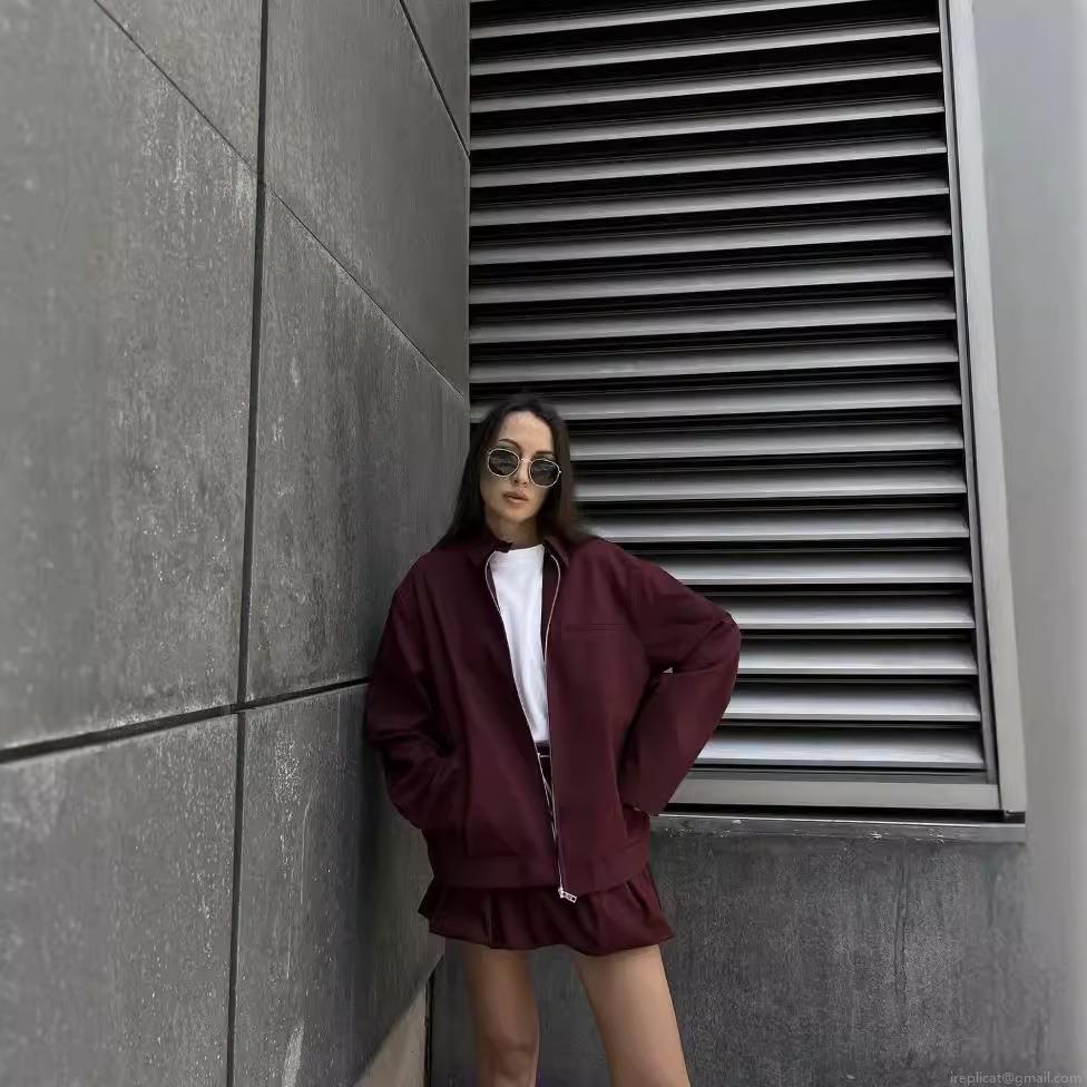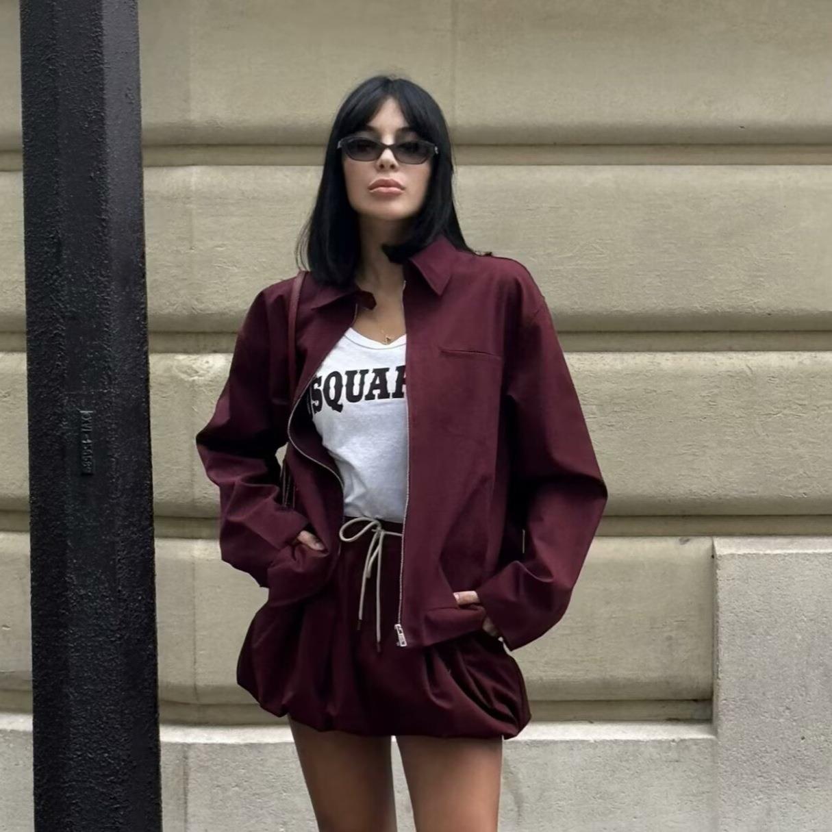 • Women's Retro American Style Burgundy Jacket and Shorts Set 2 Piece Outfits Vintage Loose Lapel Zip Up Outerwear with Drawstring Bloom Shorts Casual Streetwear