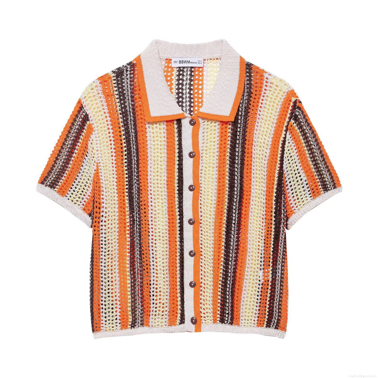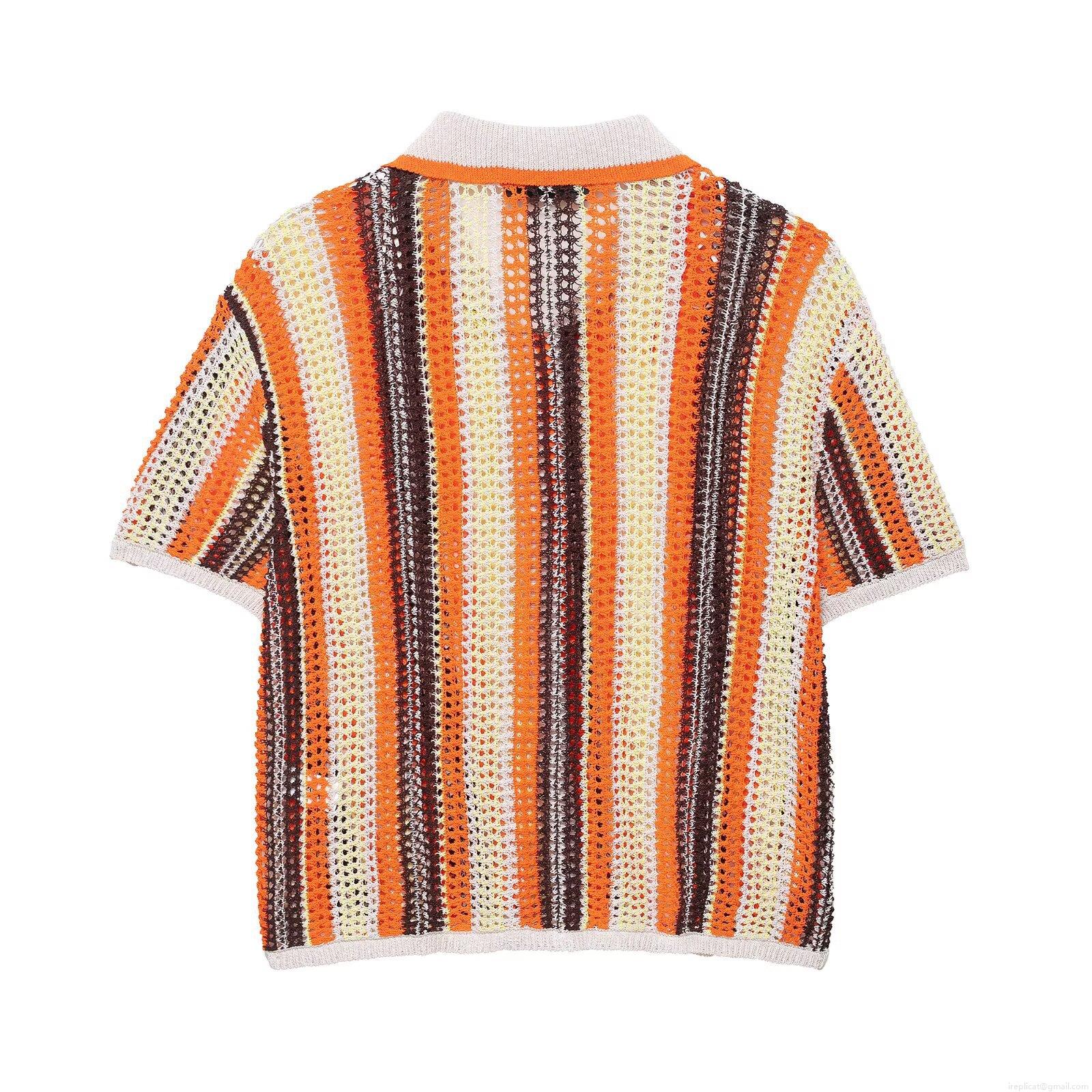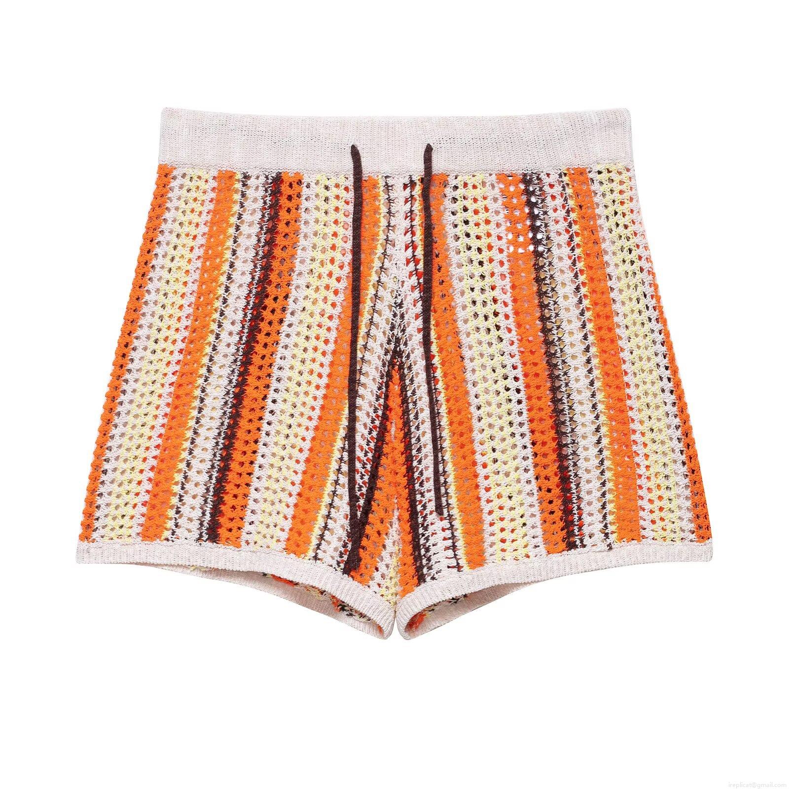 • Women's Retro Hollow Out Crochet Knit Two Piece Set Multi-Color Contrast Stripe Short Sleeve Polo Shirt And Shorts Casual Holiday Beach Vacation Co-ords Outfits