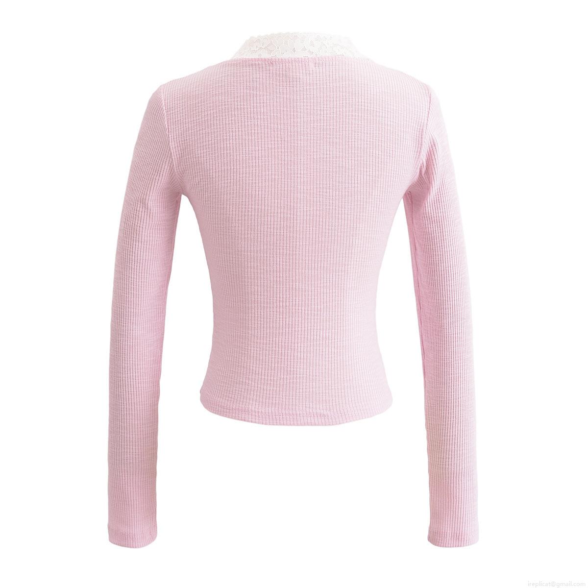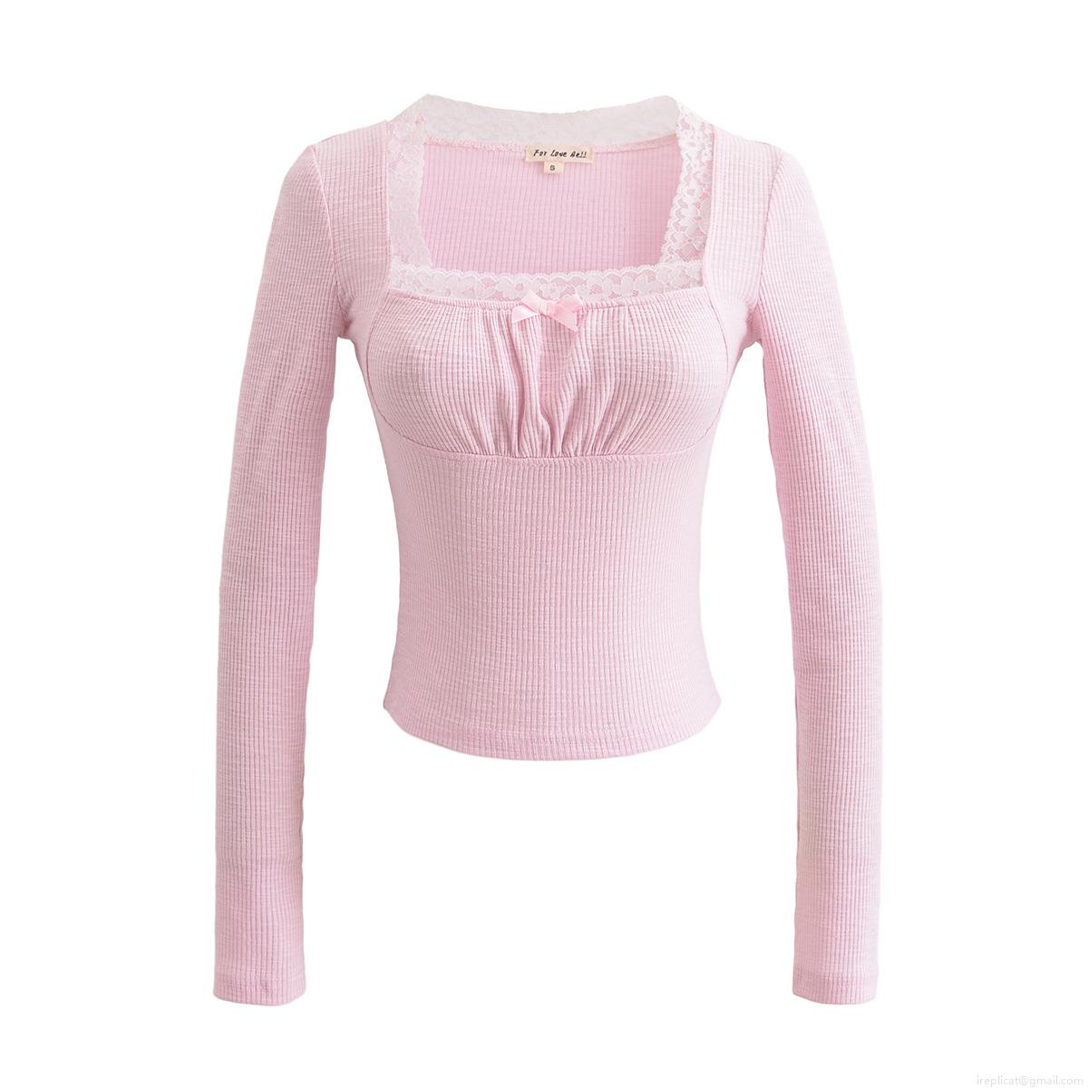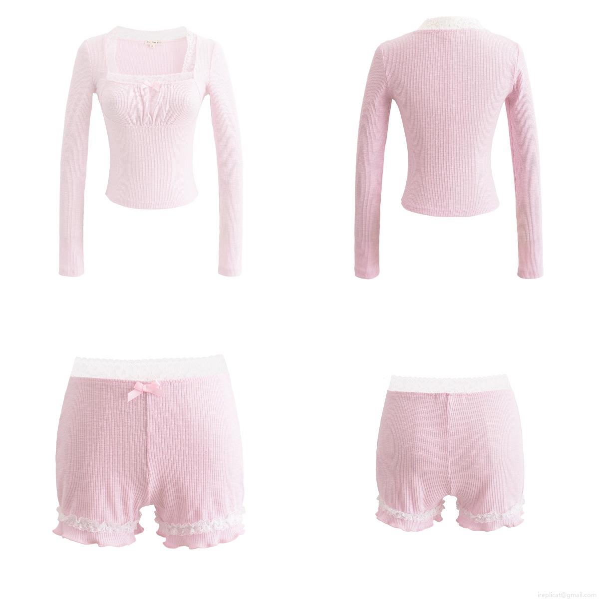 • Women's Ribbed Cotton Long Sleeve Top And Lace Shorts Set Sweet Pink Bow Trimmed Loungewear Two Piece Casual Set For Women Home Wear