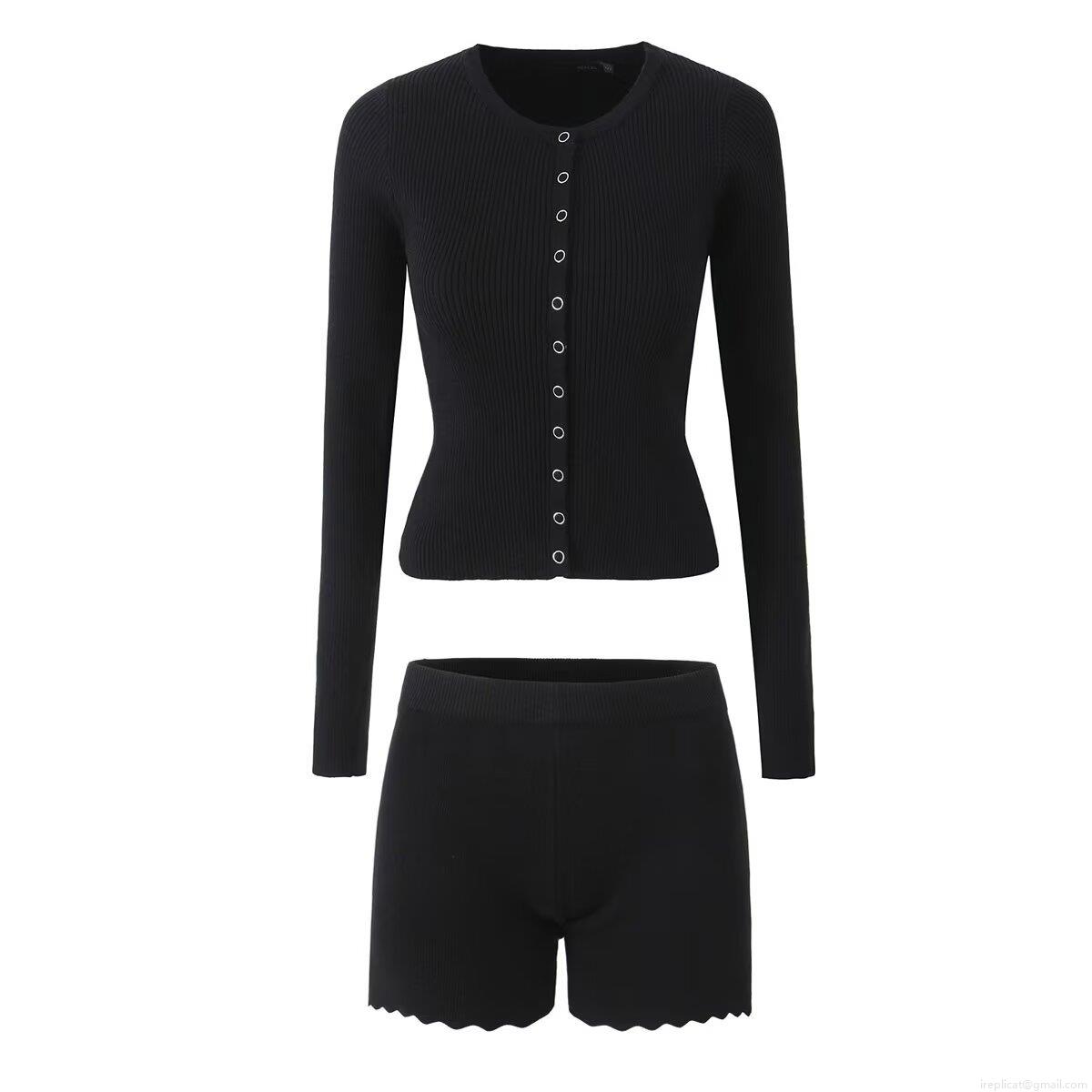 Women's Ribbed Knit Two Piece Set Single Breasted Long Sleeve Cardigan And Wave Hem Shorts Casual Solid Color Slim Fit Lounge Set