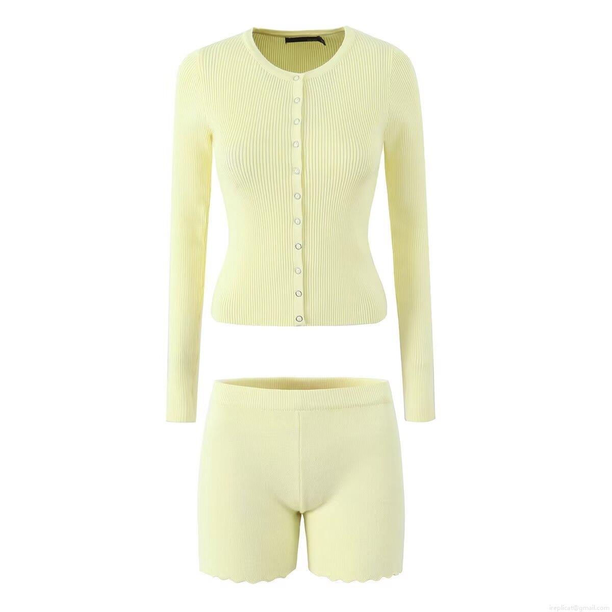 • Women's Ribbed Knit Two Piece Set Single Breasted Long Sleeve Cardigan And Wave Hem Shorts Casual Solid Color Slim Fit Lounge Set