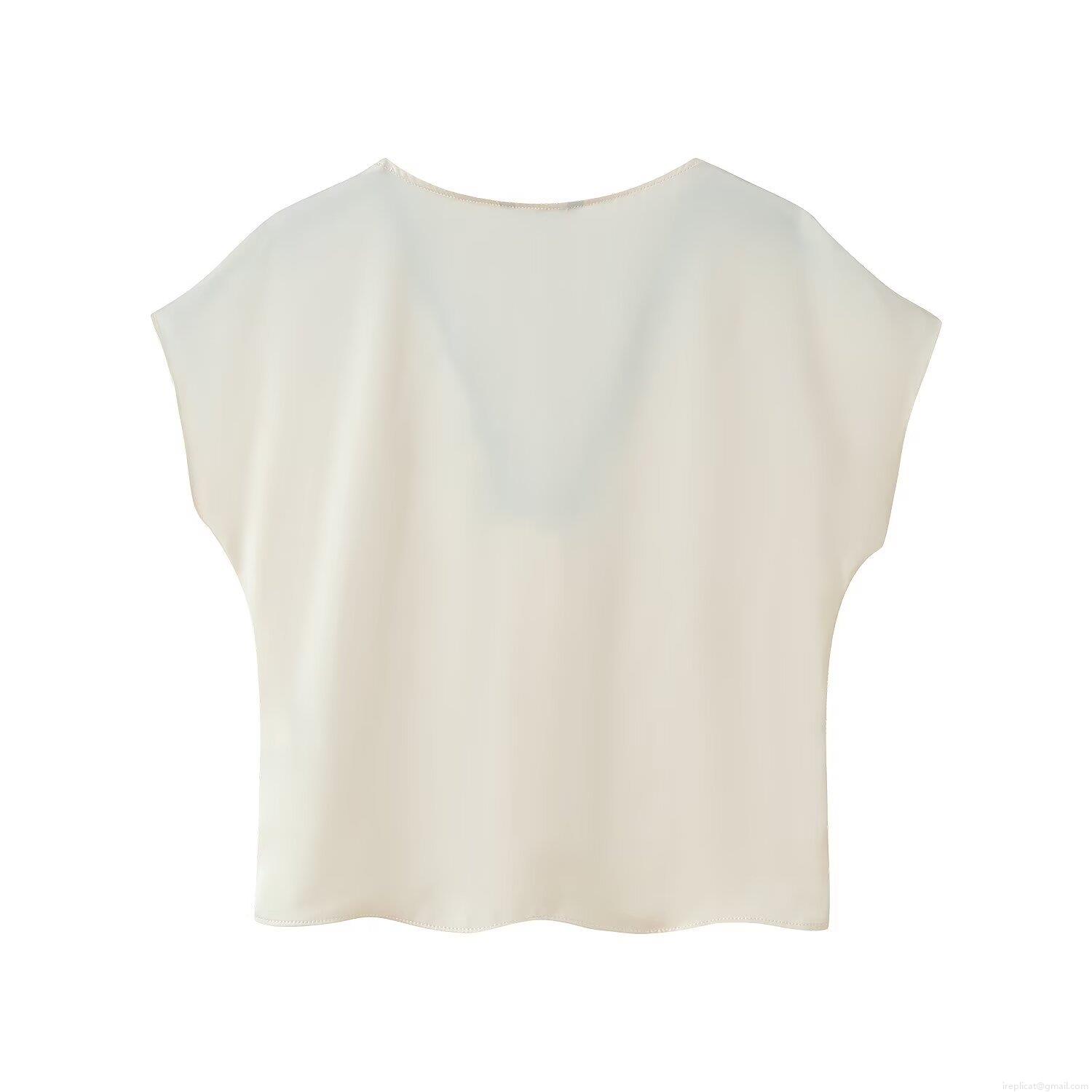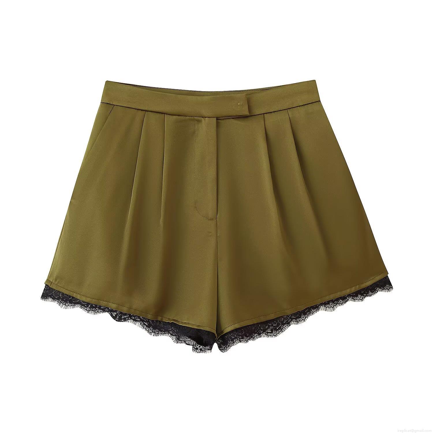 Women's Satin Two Piece Set Lace Trim V Neck Short Sleeve Button Down Shirt and High Waisted Pleated Shorts Set Olive Green Cream White Sexy Streetwear Outfits